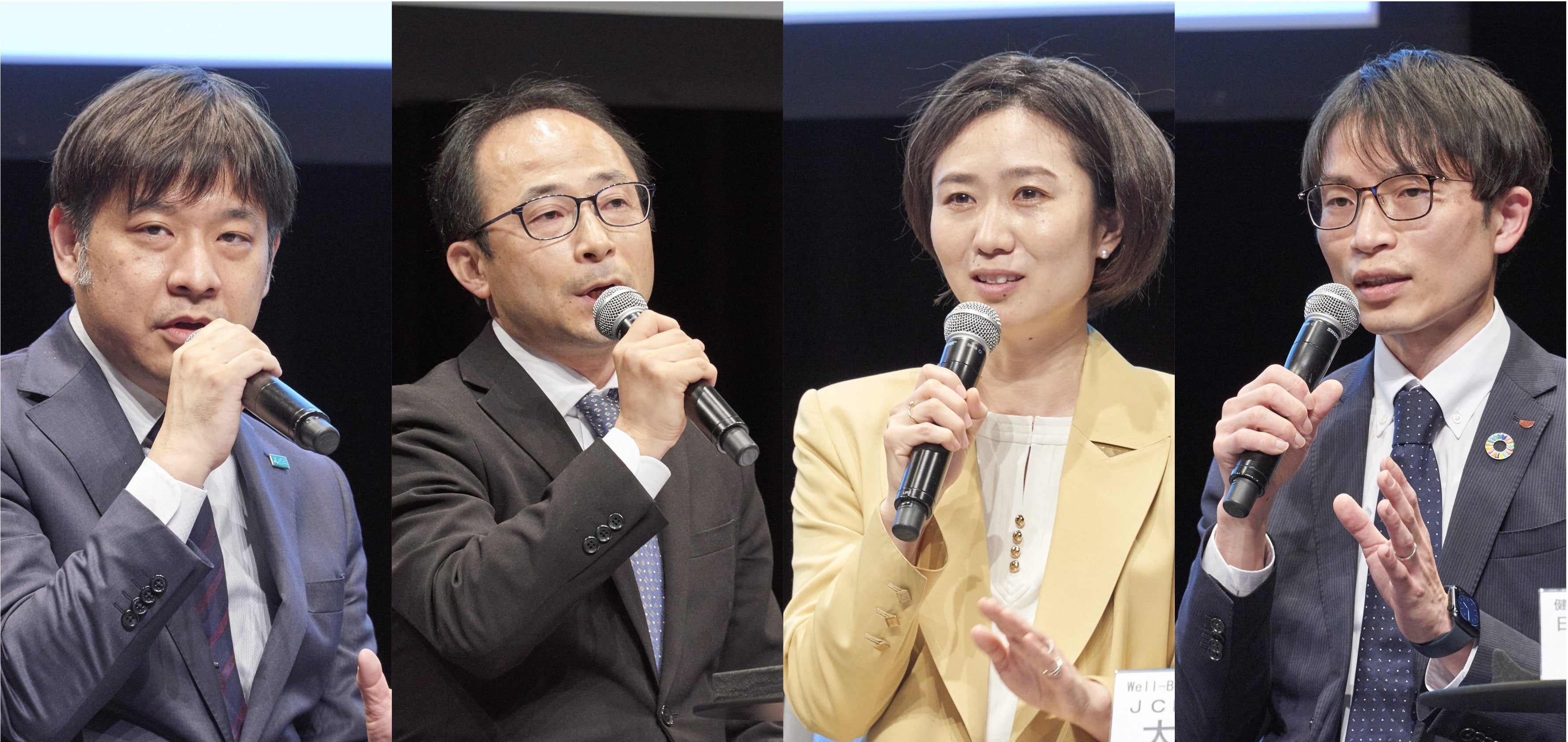 写真左より、「医療制度チーム」岡本将隆氏(JCRファーマ)、「食の未来チーム」大森健氏(江崎グリコ)「Well-Beingチーム」大西聡子氏(JCRファーマ)、「健康寿命チーム」笹岡歩氏(日清食品)