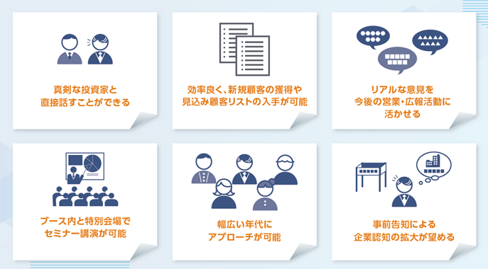 IFA・投資顧問・税理士・保険会社/保険代理店 を 出展対象 としており、従来の 資産運用 EXPOの1/4程度 の 出展料金から参加することができる。これは、来場者からの高い ニーズに加え、出展検討企業からの『 出展に興味はあるが、人員的にそこまで広いスペースがいらない 』『 小規模で事業を行っているため、出展費用が高く、出展に向けて一歩 踏み切れない 』といった声に応えるものだ。