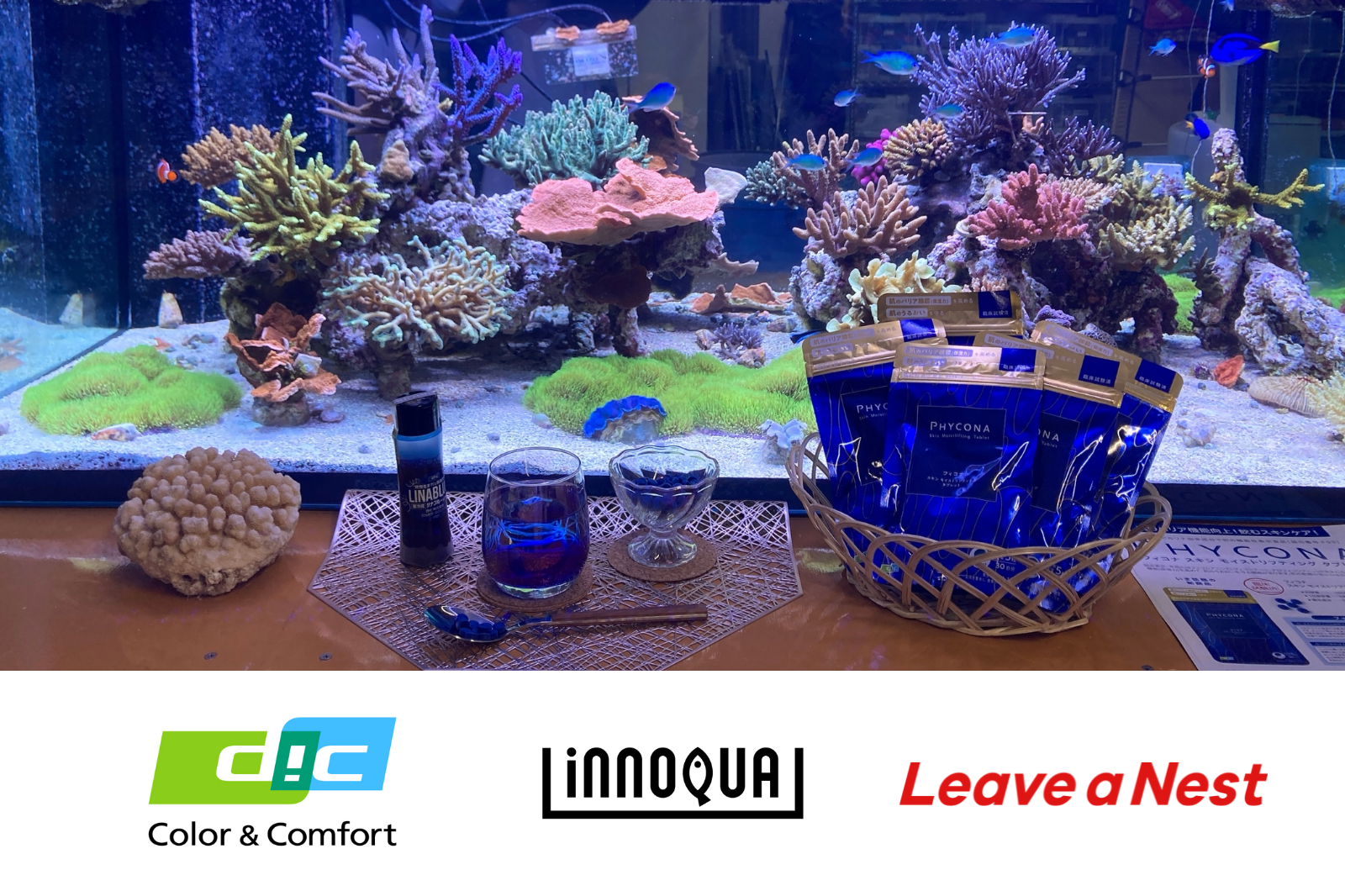 そこで、今回はイノカのコアテクノロジーにより水槽内に再現した人工生態系を用いて、DICが保有するスピルリナ由来の天然青色色素「フィコシアニン」がサンゴに与える影響について検証を開始することとなりました。フィコシアニンの抗酸化作用や青色の水溶液がもたらす光フィルター効果によりサンゴの白化現象を抑制する可能性、また、サンゴがフィコシアニンを吸着することによる赤色の蛍光発色効果及び特定波長のカットによる光ストレス抑制の可能性等について研究を進めます。