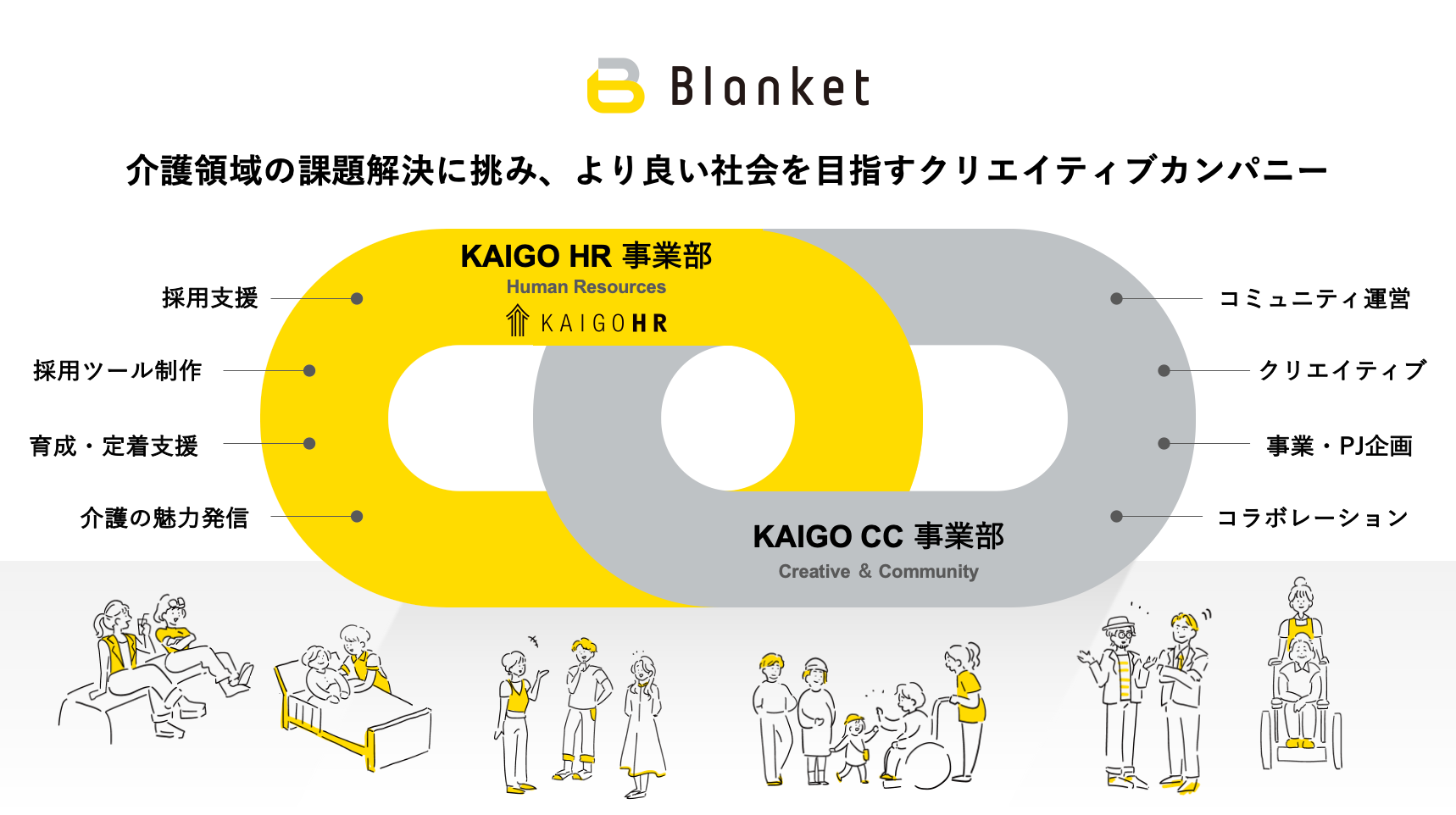 Blanketは、「介護から、人と組織が抱える葛藤を可能性に変える」をミッションに掲げ、介護・福祉業界の最大の課題である「人材の不足」という課題を解決するため、介護・福祉事業者に特化した採用・育成支援「介護の人事部 KAIGO HR」を主力事業として展開してまいりました。