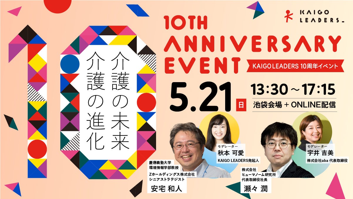 「KAIGO LEADERS」は、皆さまのおかげで今年、10周年を迎えることとなりました。応援してくださった皆さまへ、感謝とこれから先の活動展開をお伝えするため、2023年5月21日に10周年イベントを開催いたします。イベントでは、時代の先を見据えるゲストとともに、介護の未来・介護の進化についてお届けします。
