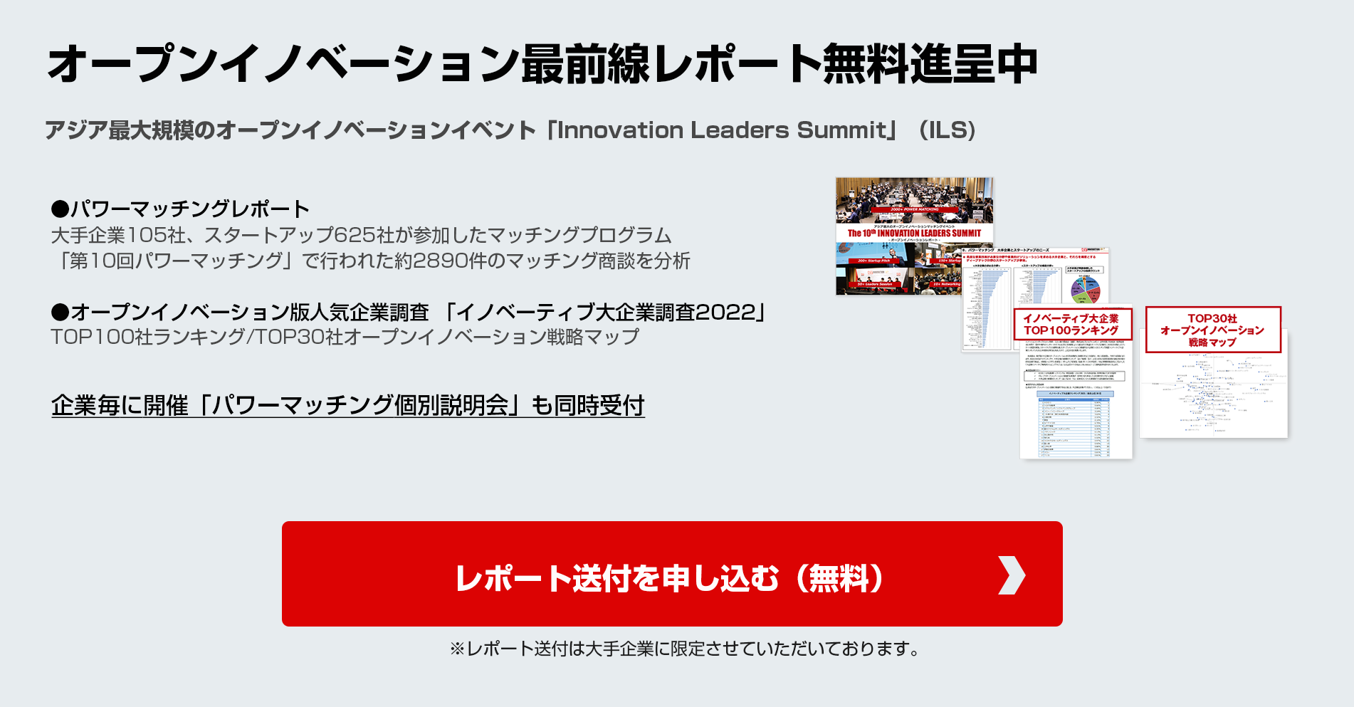 昨年11月開催の第10回ILSパワーマッチングで、大手企業105社、スタートアップ625社との間で行われた約3000件のマッチング商談を分析した「第10回パワーマッチングレポート」の配布(無料)を開始しました。