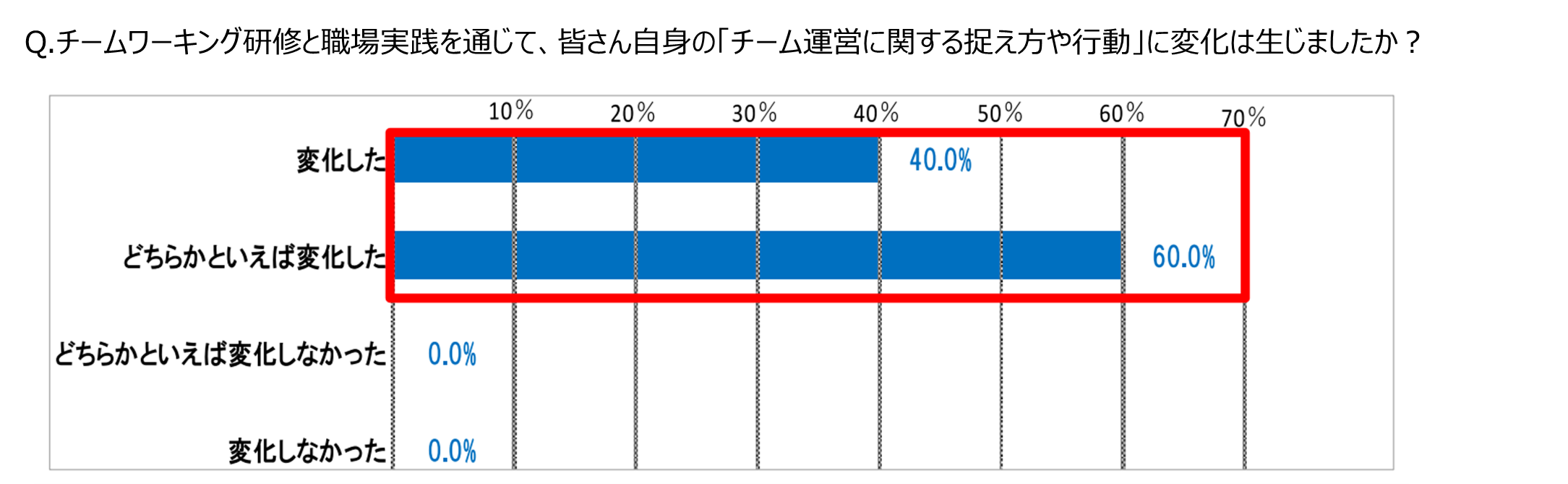 チームワーキング研修(全3回)を体験できる、モニター受講を2021年10月~12月にかけて開催し、電力・不動産・製薬など大手企業6社が参加しました。研修後のアンケートでは、受講者の 「チーム運営に関する捉え方や行動」について「変化の認識あった」との回答が100%という結果となりました。