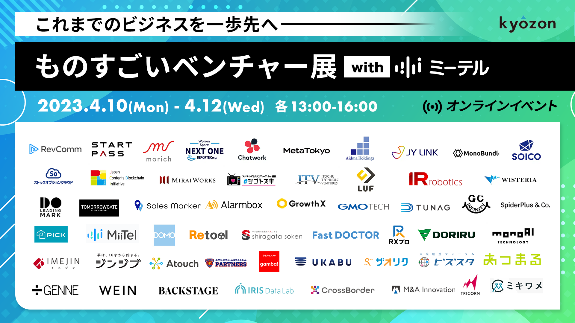 『kyozon』を運営する株式会社コミクス(本社:東京都渋⾕区、代表取締役:鈴⽊ 章裕、以下コミクス)は、2020年より続く新たな時代の展示会プラットフォーム『ものすごいベンチャー展』を開催。今年は『ものすごいベンチャー展 with ミーテル』と題し、2023年4月10日(月)〜12日(水)までの3日間で総勢2,086名の方にご参加いただいきました。