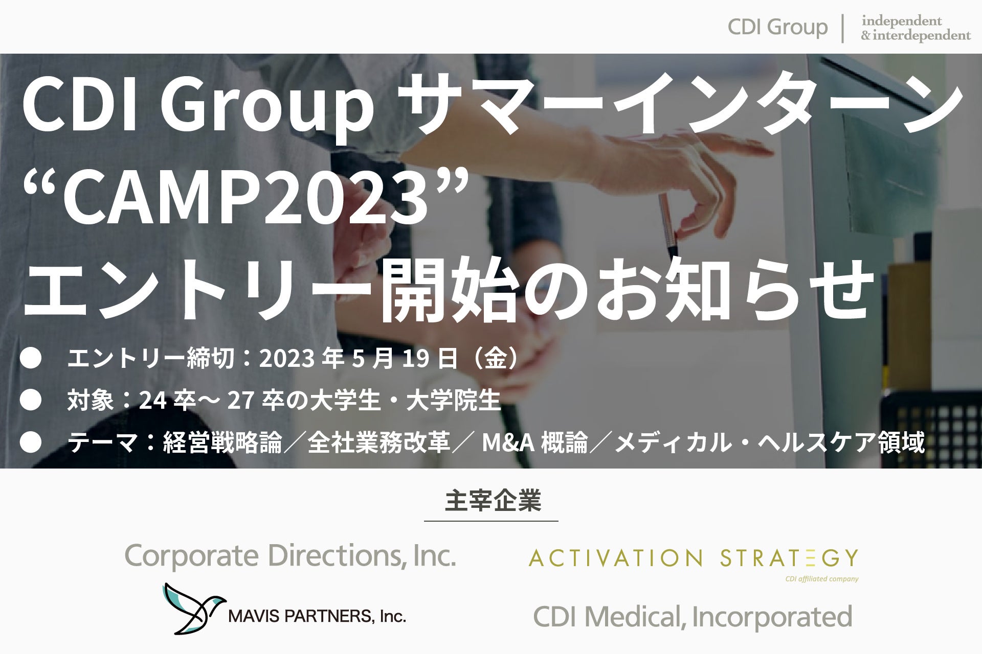 株式会社コーポレイトディレクション(本社:東京都品川区、代表取締役:小川 達大、以下「CDI」)、アクティベーションストラテジー株式会社(本社:東京都品川区、代表取締役:小川 克己、以下「ACTIVATION STRAREGY」)、株式会社CDIメディカル(本社:東京都品川区、代表取締役CEO:西土井 修、以下「CDIメディカル」)、MAVIS PARTNERS株式会社(本社:東京都港区、代表取締役:田中大貴、以下「MAVIS PARTNERS」)は、2024年~27年卒業予定の大学生・大学院生を対象に、サマーインターンシップ「CAMP2023」を開催いたします。
