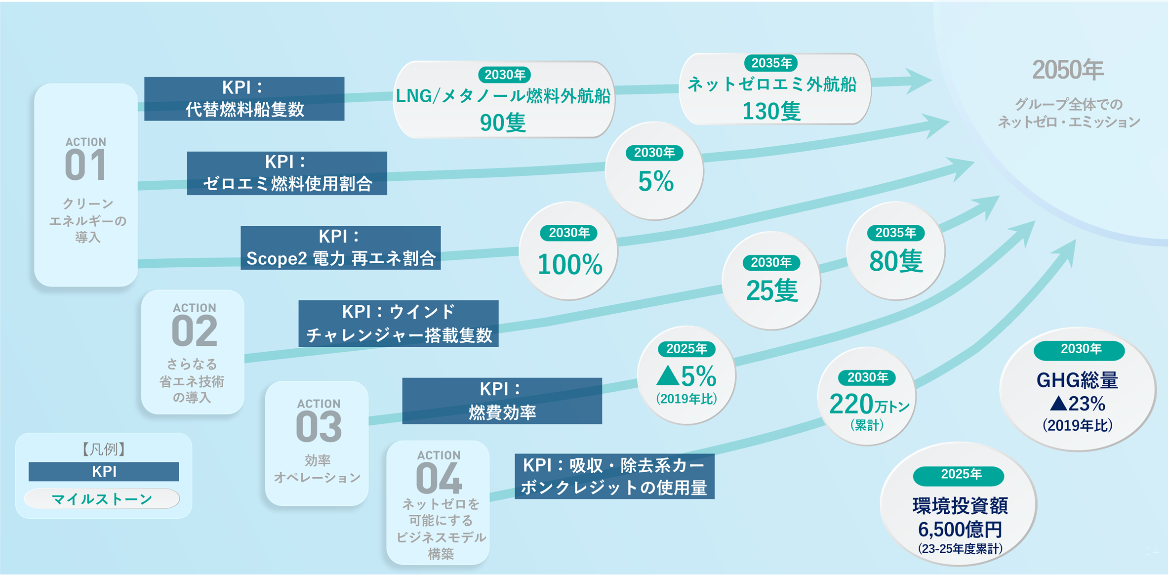 2050年までのネットゼロ・エミッションを確実に達成するため、アクションごとに進捗を測る定量KPIとマイルストーンを設置しました。