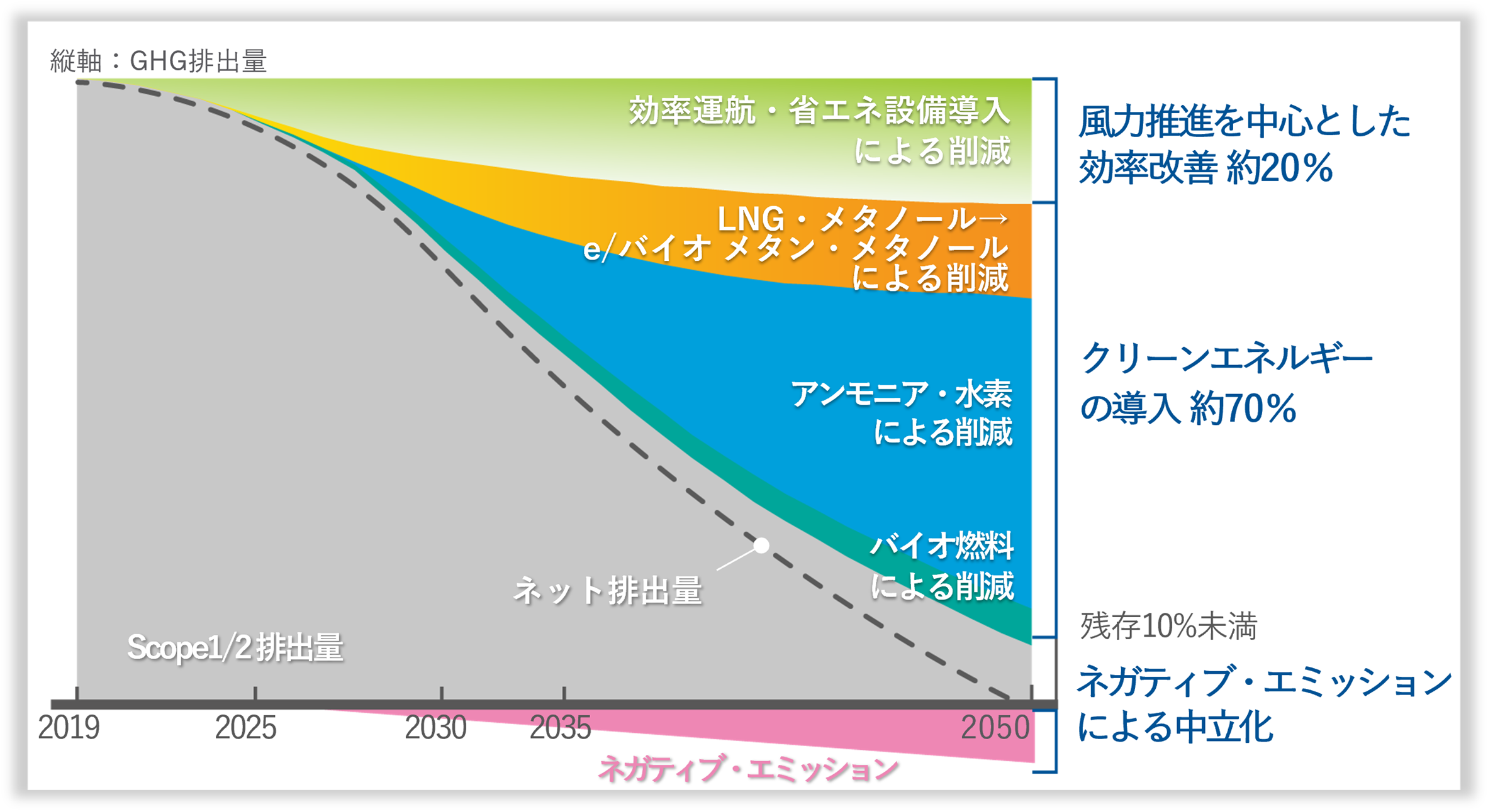「環境ビジョン2.2」は、2021年6月に発表した「商船三井グループ 環境ビジョン2.1」からの着実な進捗を示すとともに、目標達成に向けた重要な指標としてKPI・マイルストーンを追加・更新することで取り組みの実効性を高め、具体的なGHG排出削減の道筋を描くことでネットゼロ・エミッション移行計画をより明確化しました。