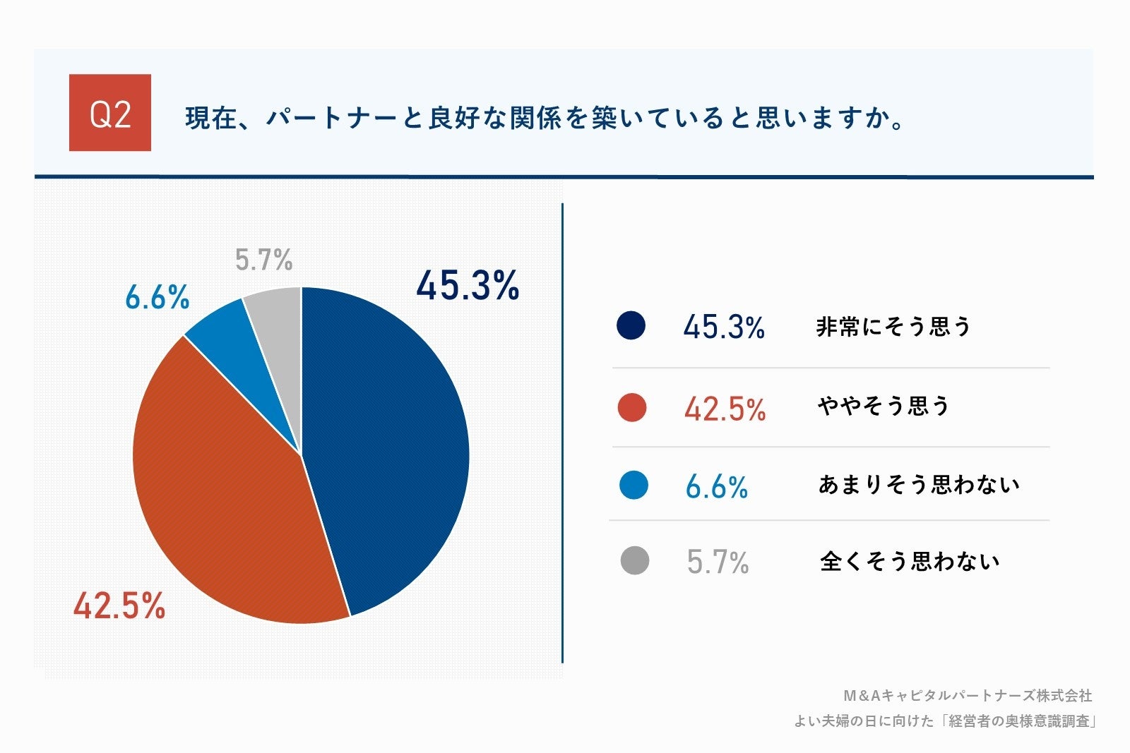 「Q2.現在、パートナーと良好な関係を築いていると思いますか。」(n=106)と質問したところ、「非常にそう思う」が45.3%、「ややそう思う」が42.5%という回答となりました。