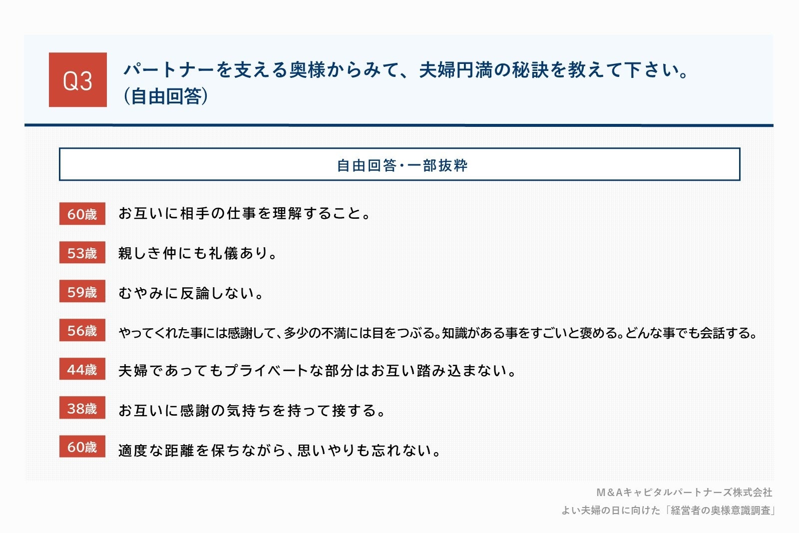 ■Q3.パートナーを支える奥様からみて、夫婦円満の秘訣を教えて下さい。(自由回答)