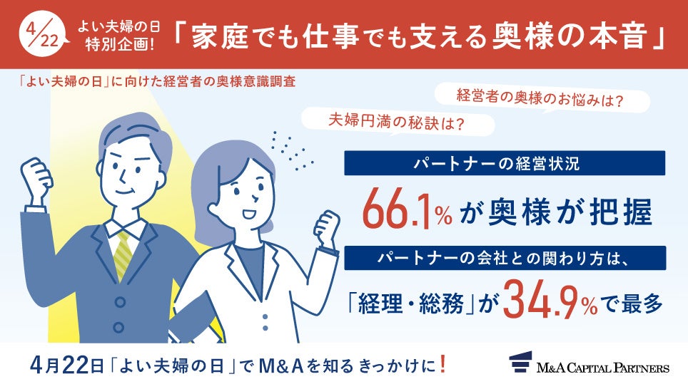 今回の調査では、経営者の夫を家庭でも仕事でも支えている奥様が、夫の仕事に対する姿勢を尊敬し、忙しいながらも食事や旅行を楽しみながら、円満な夫婦関係を築いていることが分かりました。4月22日は「よい夫婦の日」です。回答してくださったご家庭をはじめ、全てのご夫婦が素敵な時間を過ごせることを心から願っております。