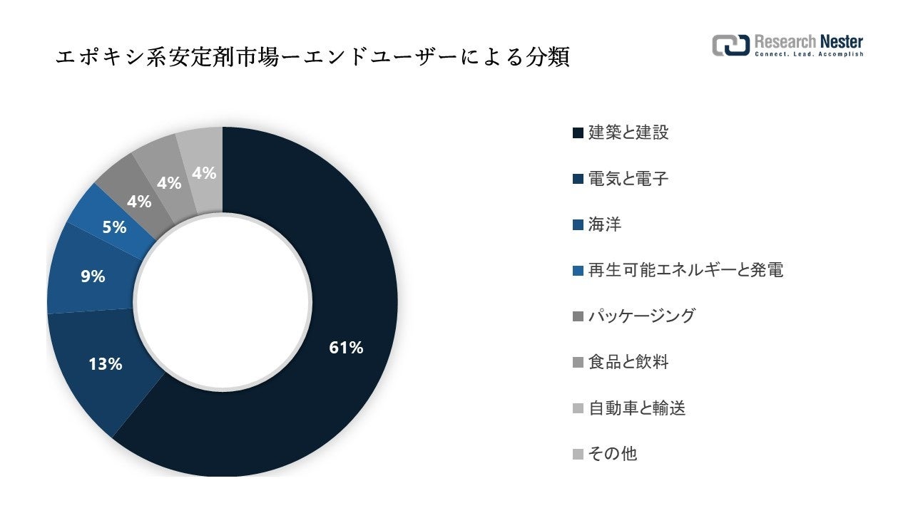 世界のエポキシ系安定剤市場は、電気および電子機器、海洋、再生可能エネルギーと発電、包装、食品と飲料、建築と建設、自動車と輸送などに、エンドユーザー別の需要と供給についても分割および分析されています。これらのセグメントの中で、建築と建設セグメントは大きなシェアを獲得すると予想されます。市場分析によると、増加する建設および建築部門は、今後数年間で市場の成長を促進すると推定されています。2021 年の米国の建設部門の価値は、1 兆米ドルを超えると推定されました。エポキシ樹脂は、建設と建築業界で接着剤またはコーティング材料として使用されます。