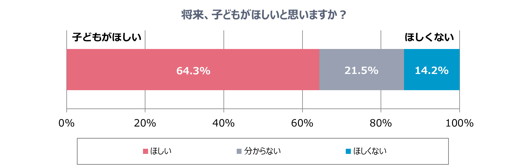 将来、子どもがほしいと思っているかどうか聞いたところ、子どもが「ほしい」人は64.3%、「ほしくない」人は14.2%でした。