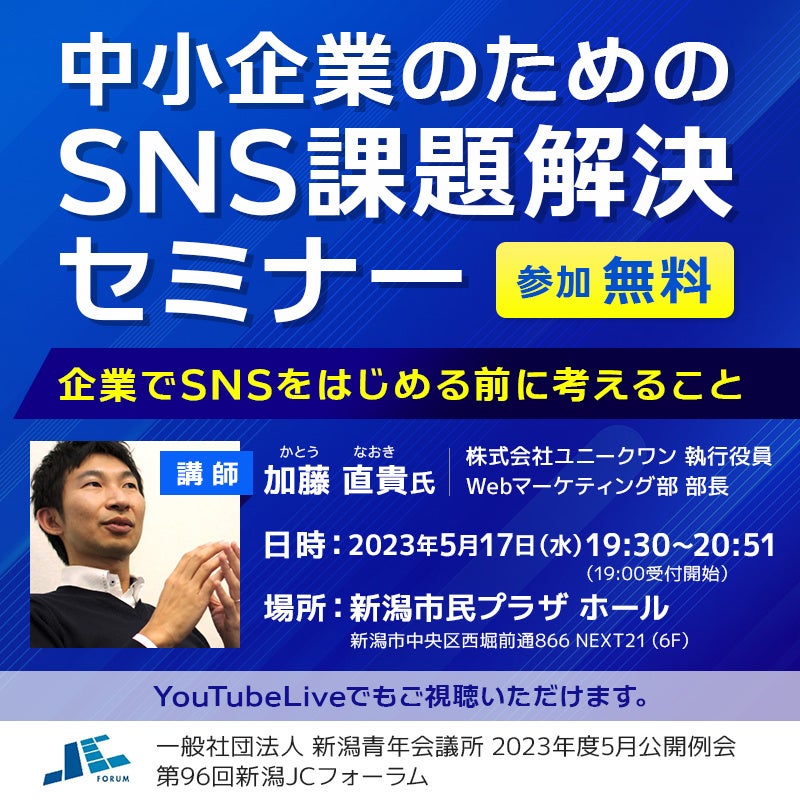 この度、新潟青年会議所の財政規則審査特別委員会が中小企業のためのSNS課題解決セミナー~企業でSNSをはじめる前に考えること~を開催致します。SNSを運用しているが、思うように効果が上がっていないのはなぜか。SNSとは本当に効果的なのか。SNSを行う必要があるのか。SNSを運用する前に考えなければならなかったこととは。ソーシャルリスク対策とは。等をテーマに講師に講演をしていただき、講演の最中に参加者にアンケートを行うことによって双方向型ワークショップを企画しております。