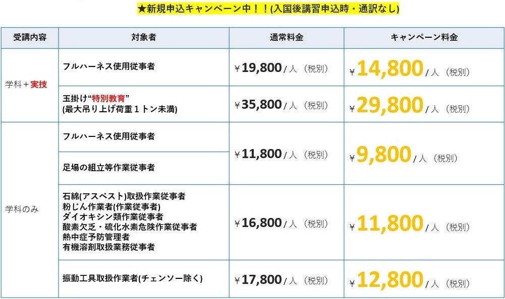 技能実習生の入国後講習施設で特別教育を受講することが可能となっています。入国後講習終了後、配属前の実習生を対象に特別教育を行っています。