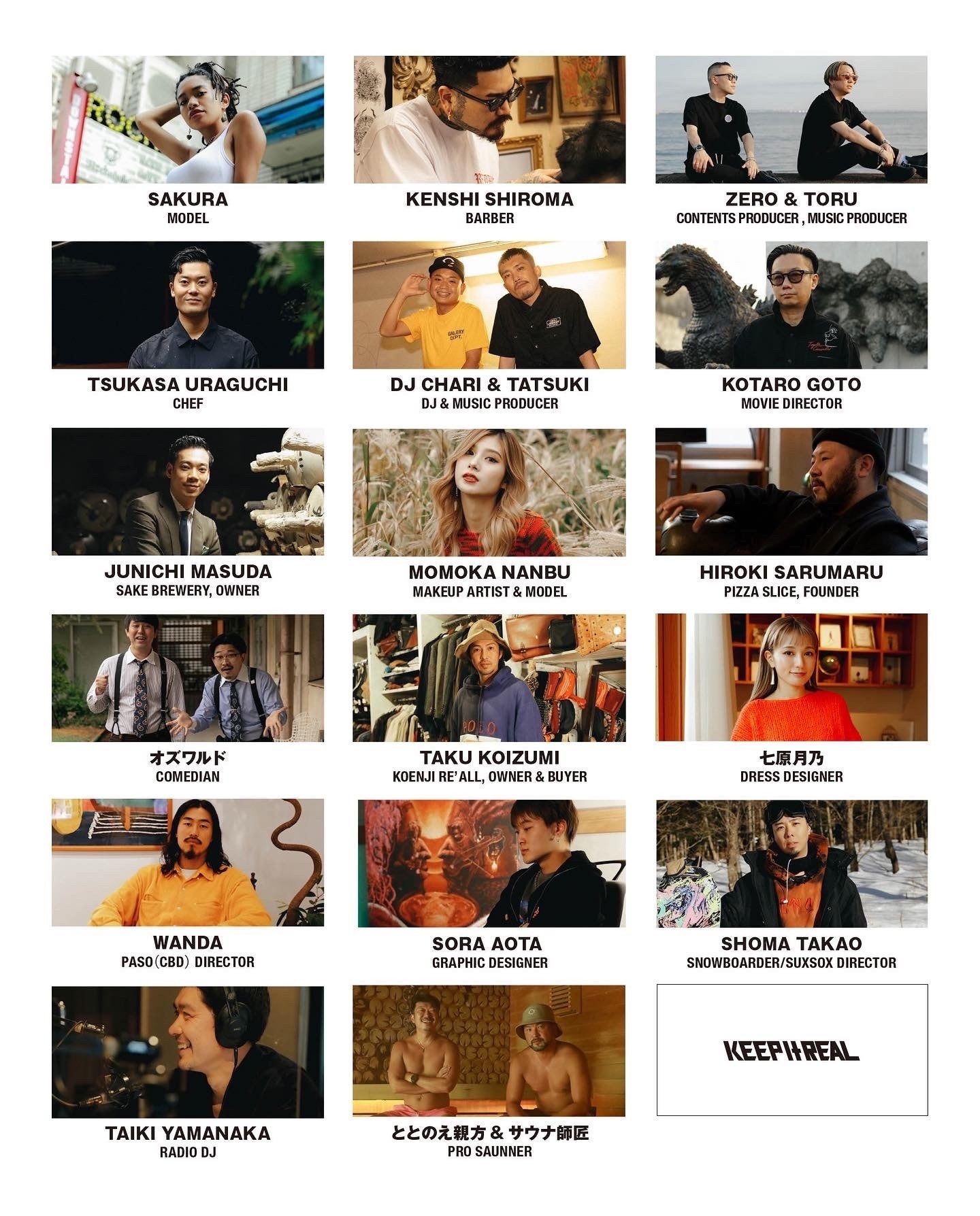 KEEP IT REALのプロデューサーである rikumaru が東京を拠点にDJとして活動する中で知り合った親交のあるメンバーです。記念すべき第一弾の出演者には、Netflixオリジナルシリーズ「全裸監督 シーズン2」監督である後藤 孝太郎氏や吉本興業の芸人であるオズワルド、また、日本のバーバー文化を牽引する「MR.BROTHERS CUT CLUB」の城間健士氏等、幅広い業界で活躍する“今をトキメク総勢14組”の出演者の方々が参加しています。