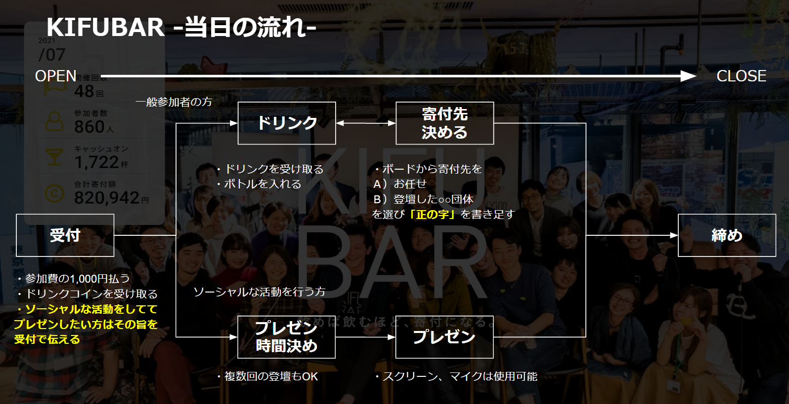 2017年11月に初めて開催し、有志メンバーにより定期的に開催して来ましたが、コロナ禍の影響でBAR形式の飲食店やイベントは軒並み開催を制限。一次的にKIFUBARも開催を中止していましたが、それでも依然として社会課題は存在し、寄付を必要としている場所はたくさんある状況を受けて、昨年より開催を再開しました。これまで累計53回開催、980名以上参加し、2,100杯以上のオーダーに繋がり、計100万円以上を寄付しています。