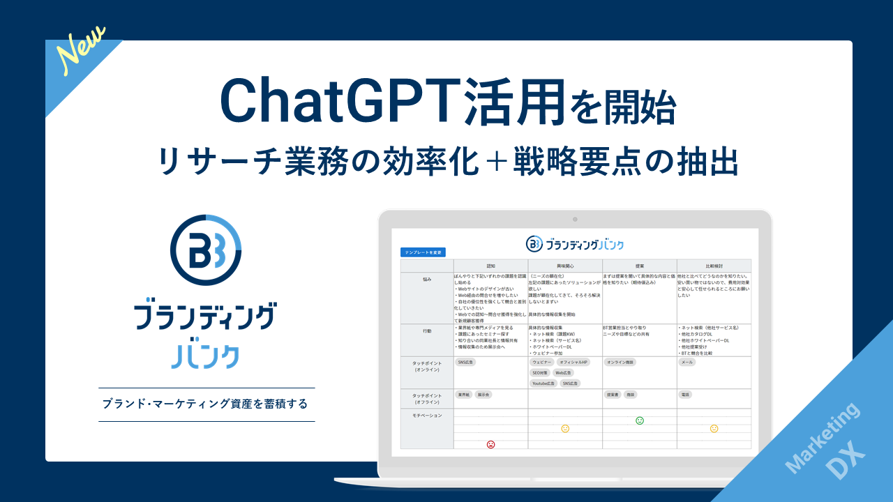 当社では2021年10月より、ブランディングやマーケティング戦略に関する情報を蓄積するための「ブランディングバンク」へのデータ蓄積を進めてきました。ブランディングバンクを活用することで、戦略や施策内容、成果に関する蓄積データから、最適な施策を導くことが可能となります。