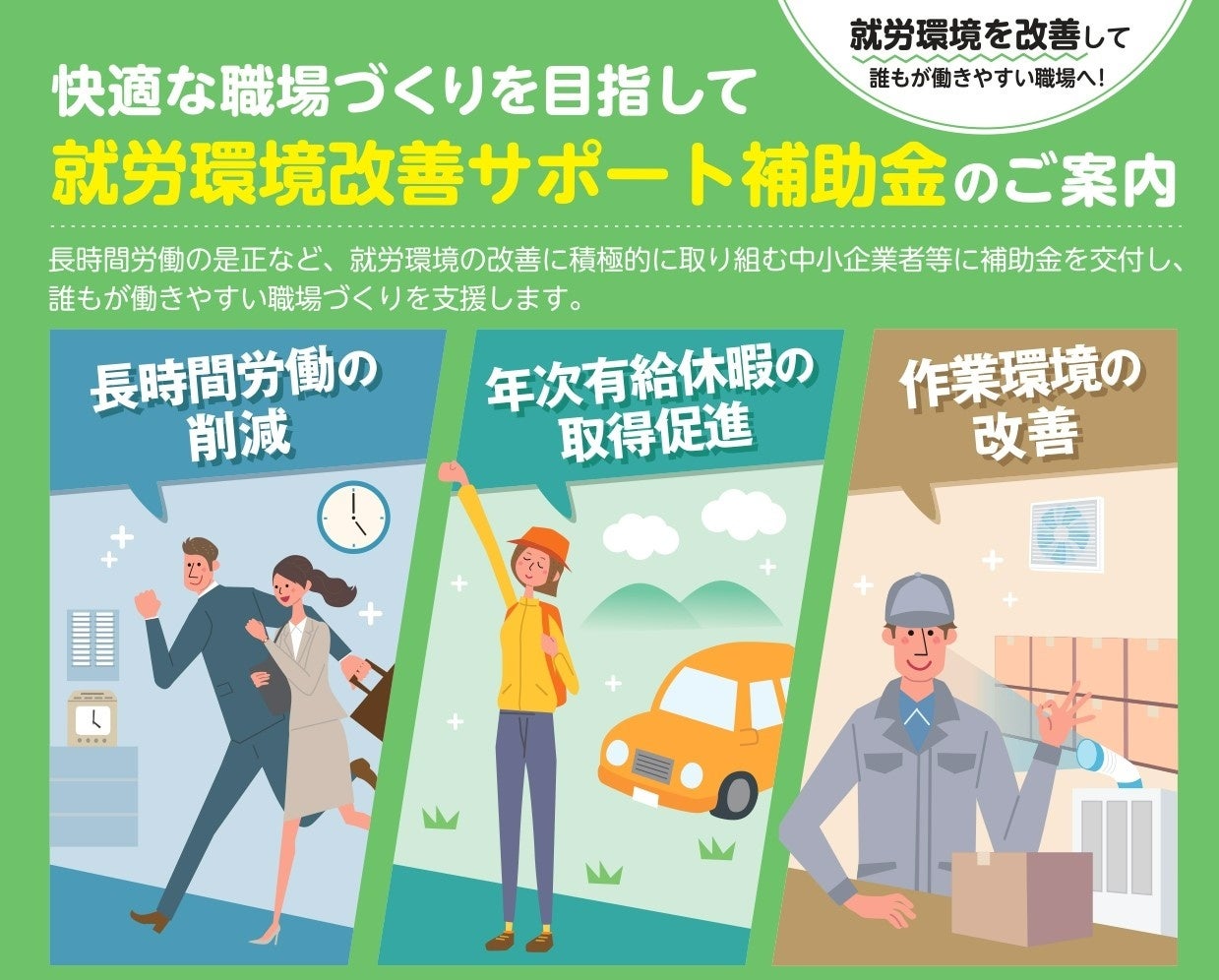 京都府では、長時間労働の削減や就労環境の改善など、誰もが働きやすい職場づくりの取組を効果的に推進するため、「就労環境改善サポート補助金」を用意し、中小企業等の取組をサポートしています。