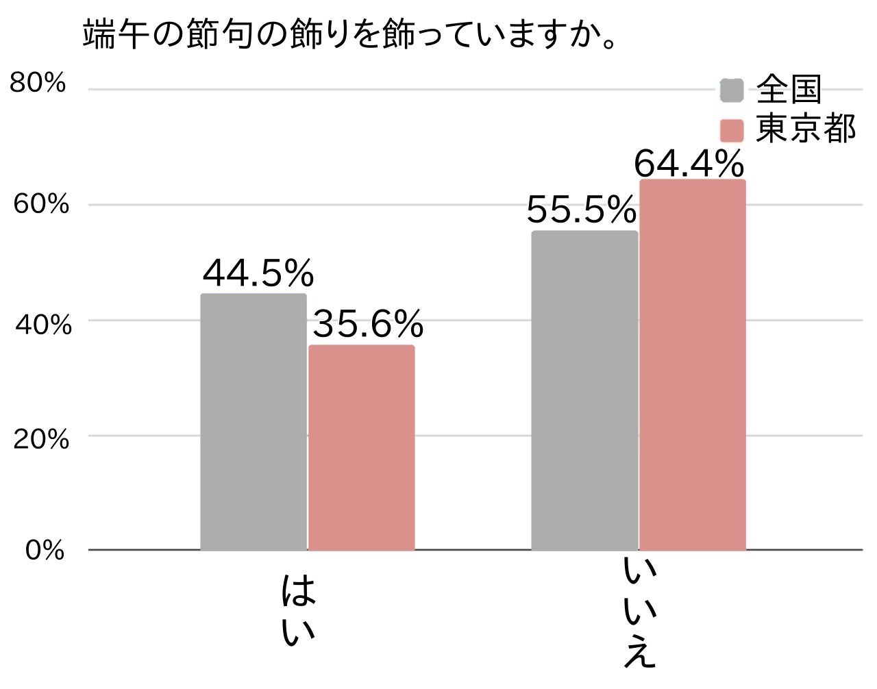 鯉のぼりを飾っている方の割合は全国で30.9%・東京都で42.9%でした。全国と比較して、東京都では鯉のぼりがより好まれていることが分かりました。