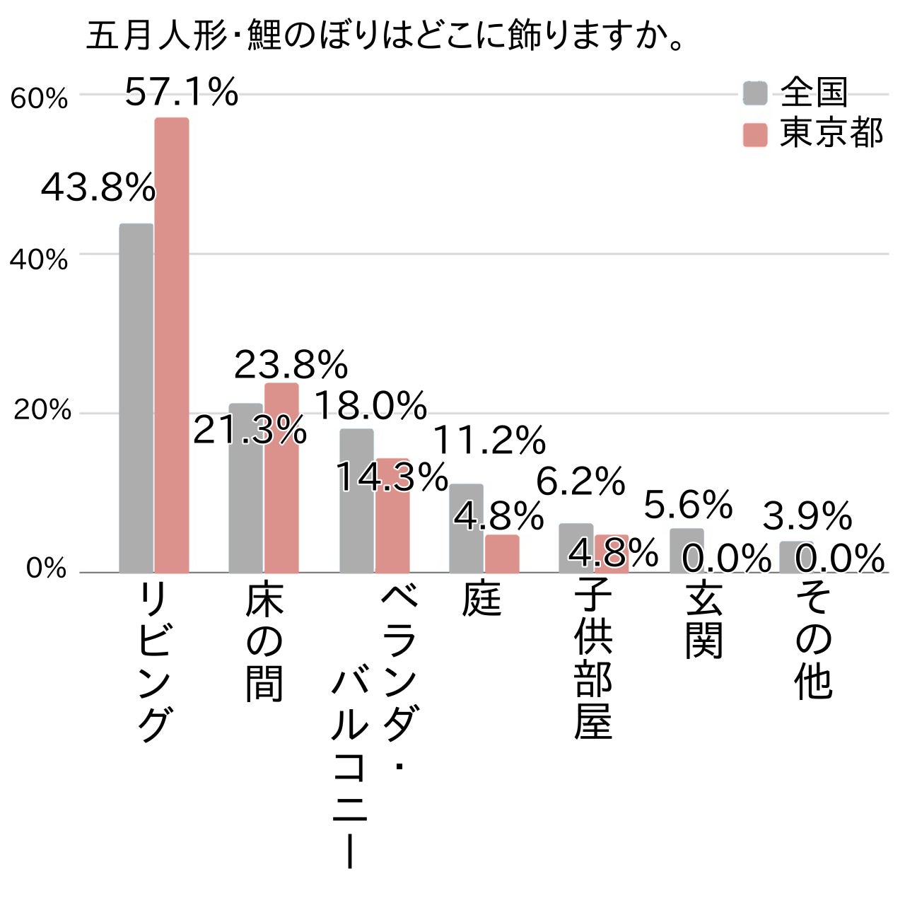 リビング・床の間とも屋内かつ家族が集まる場所であることが共通しており、家族みんなで端午の節句を祝う家庭が多いことが分かります。