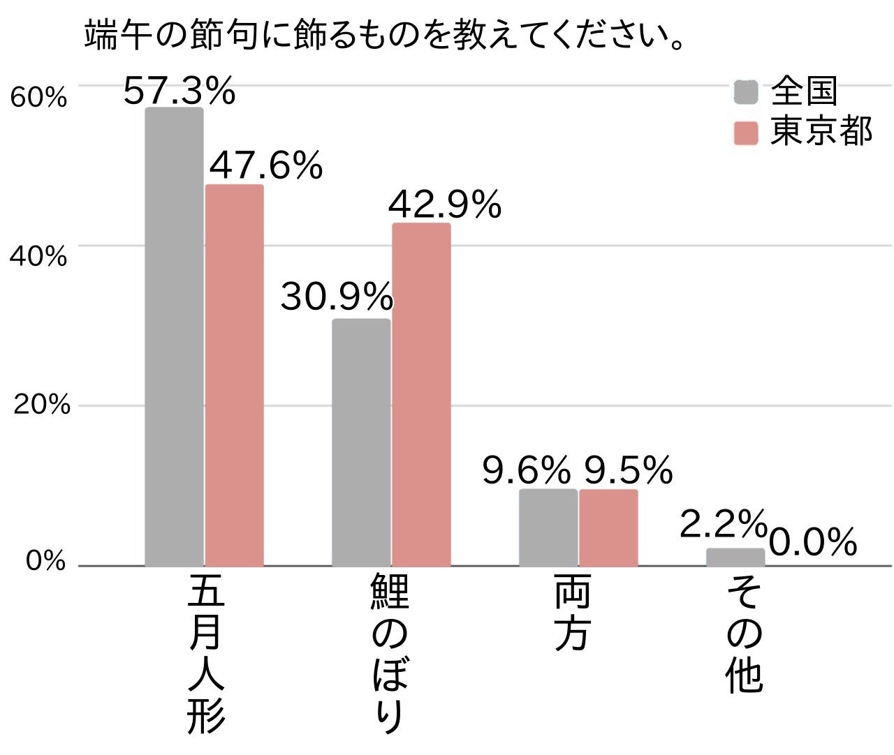 最も多かったのは五月人形で、全国で57.3%・東京都で47.6%でした。全国・東京都の両方で五月人形を飾るという意見が最も多いという結果になりました。