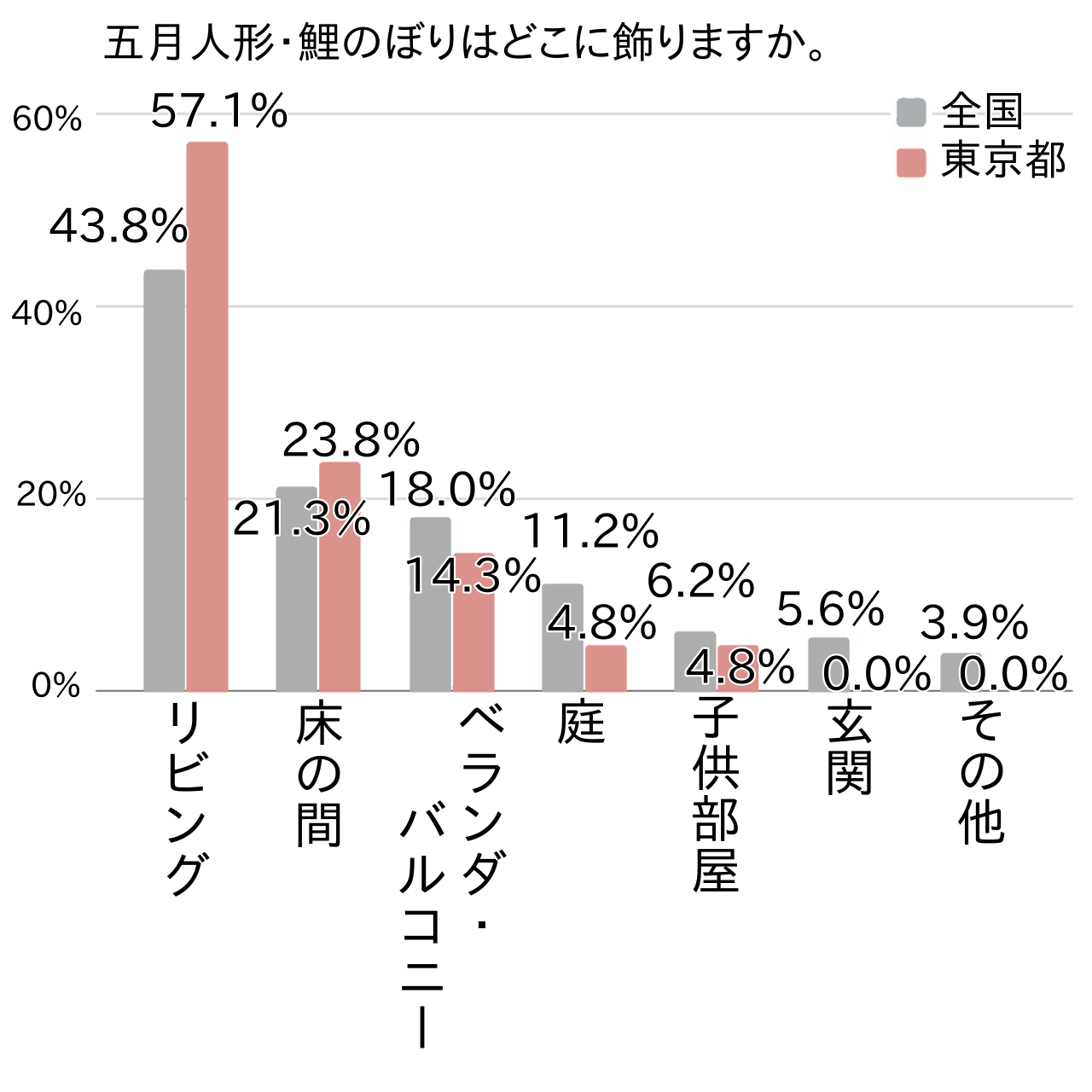 リビング・床の間とも屋内かつ家族が集まる場所であることが共通しており、家族みんなで端午の節句を祝う家庭が多いことが分かります。