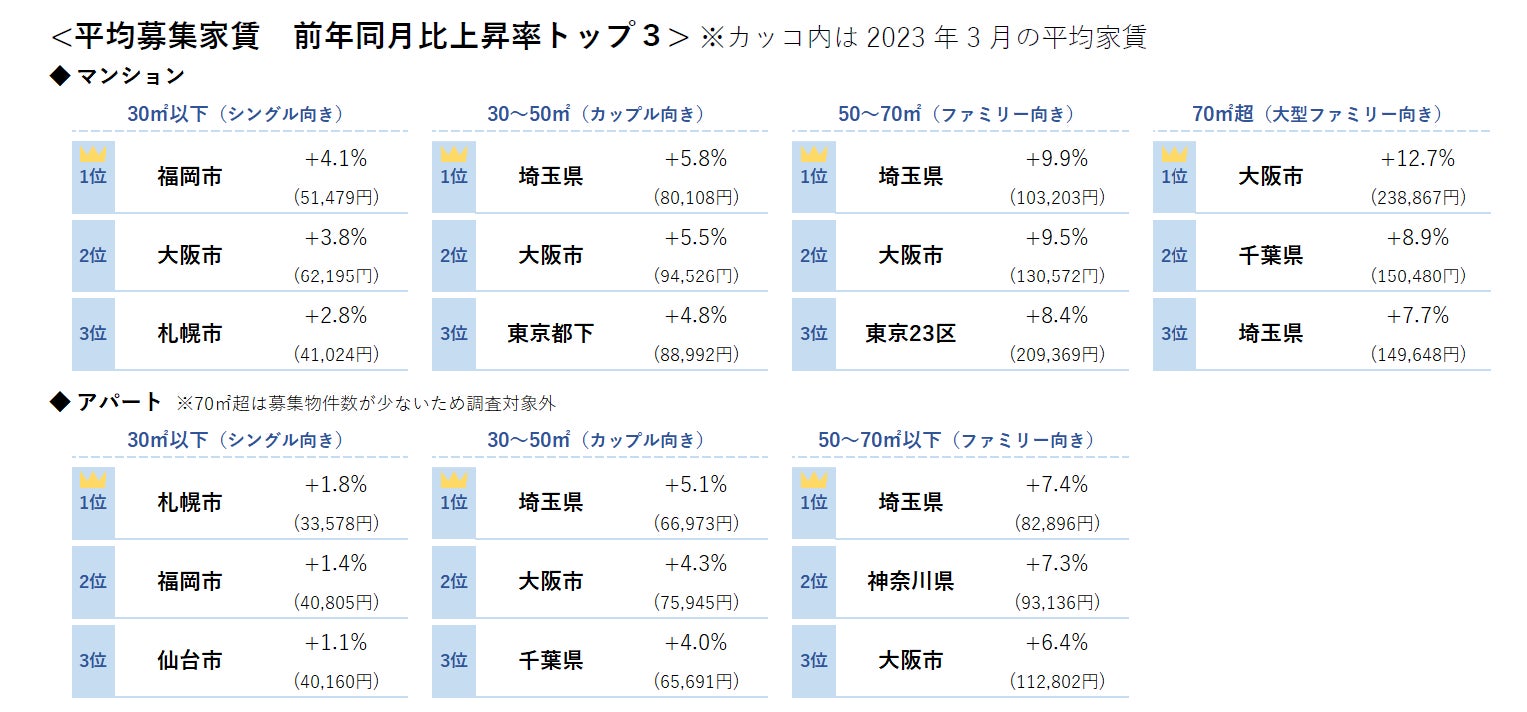 <2023年3月 全国主要都市における賃貸マンション・アパートの平均家賃(面積帯別)>