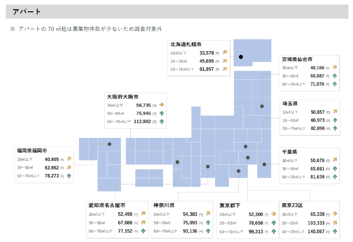 ・コメントでは、30㎡以下を「シングル向き」、30㎡~50㎡以下を「カップル向き」、50㎡~70㎡以下を「ファミリー向き」、70㎡超を「大型ファミリー向き」としています。