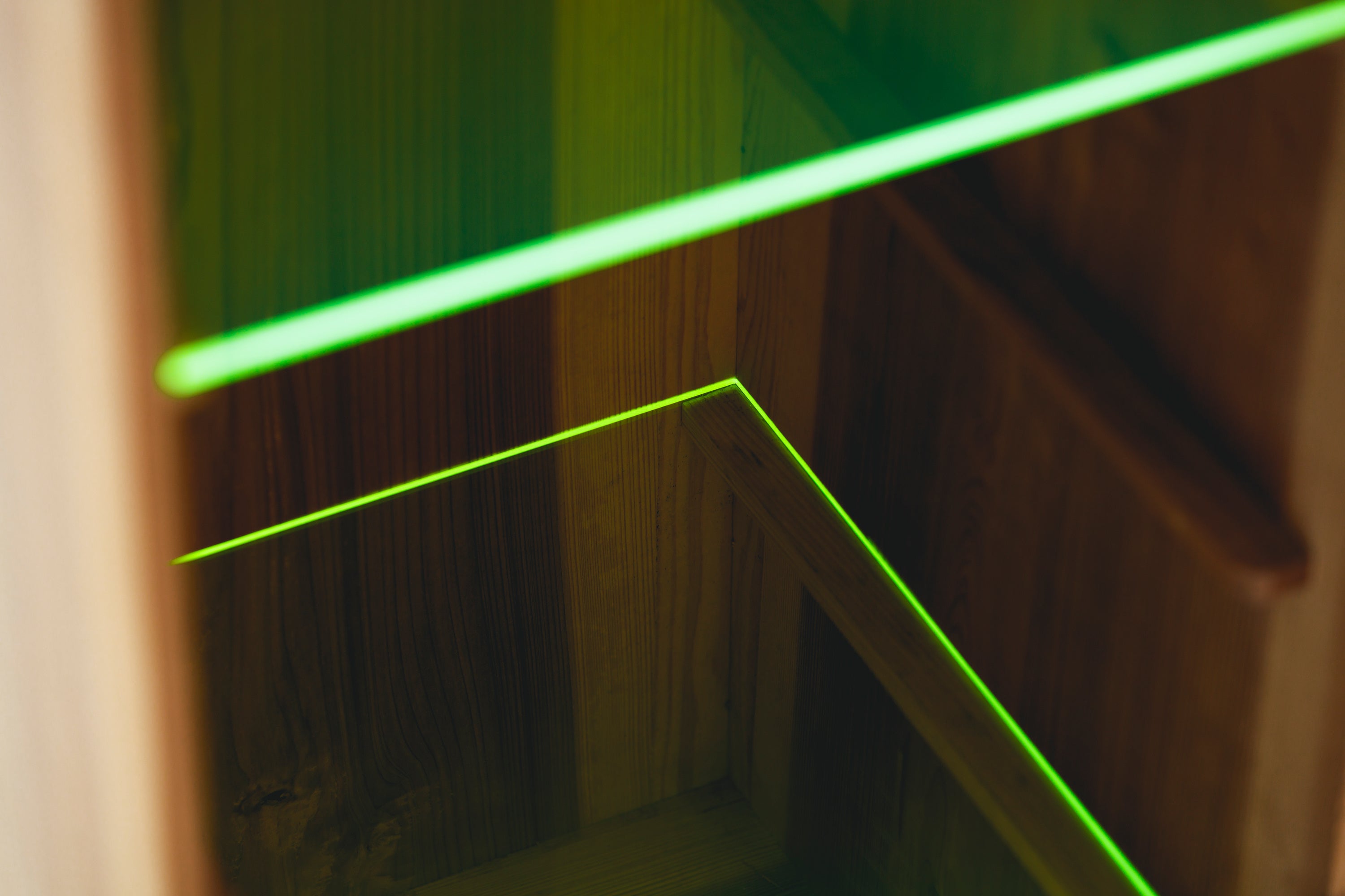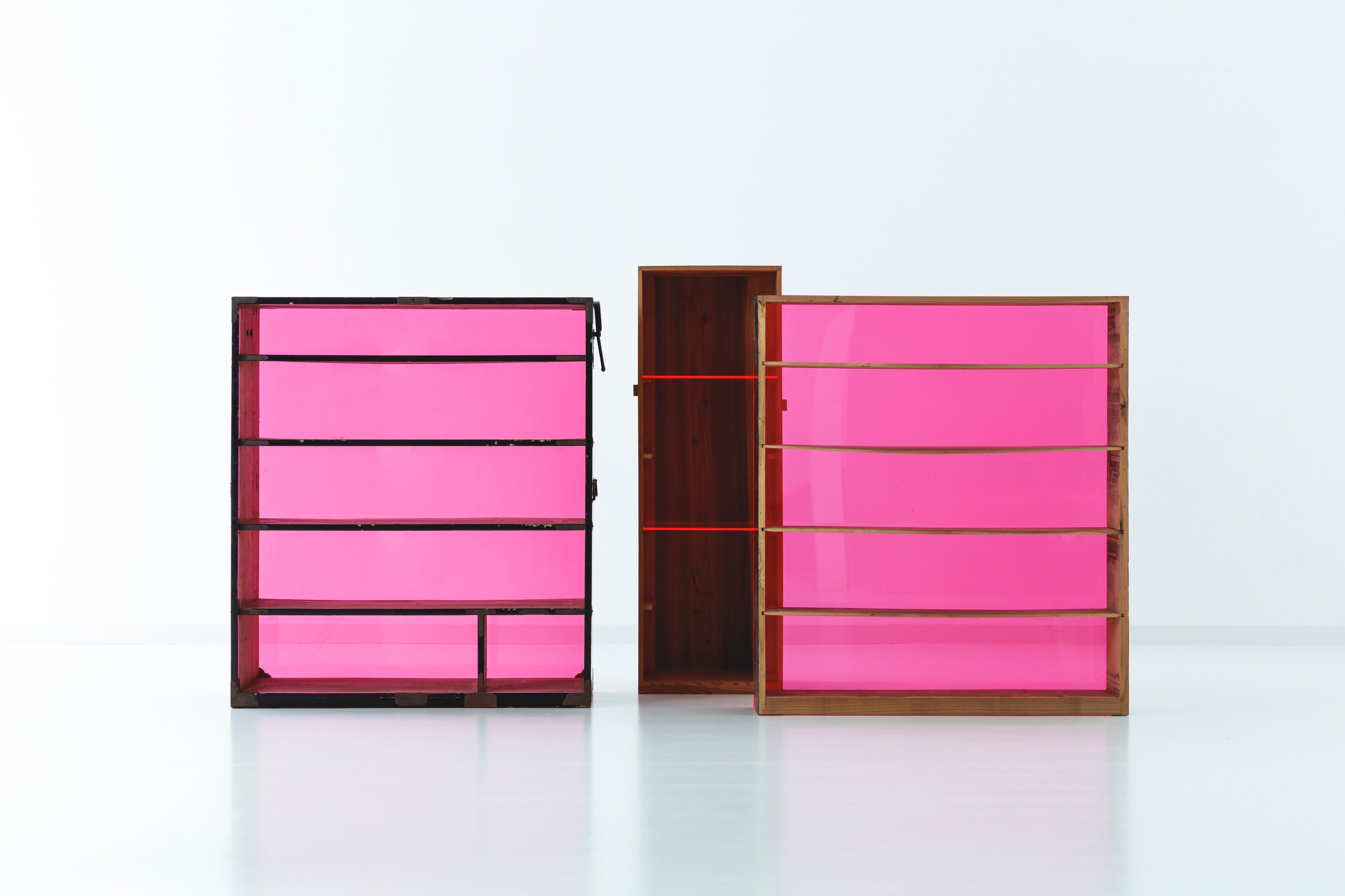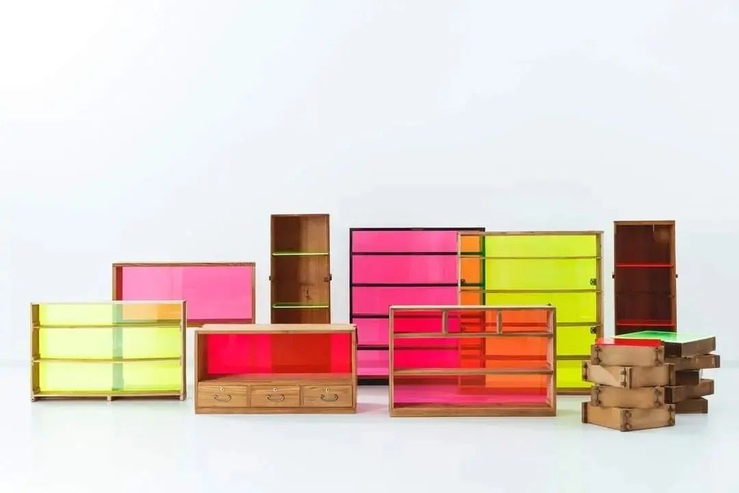 「P/OP(tansu×acrylic)」は本社のある富山県内の空き家に赴き、まだ使える箪笥や木彫りの熊などをレスキューしアップサイクル家具として加工販売を行います。現代の素材の中から未来感を感じられる蛍光アクリルを古箪笥と組み合わせることで新旧を引き立て合うことを意図しました。