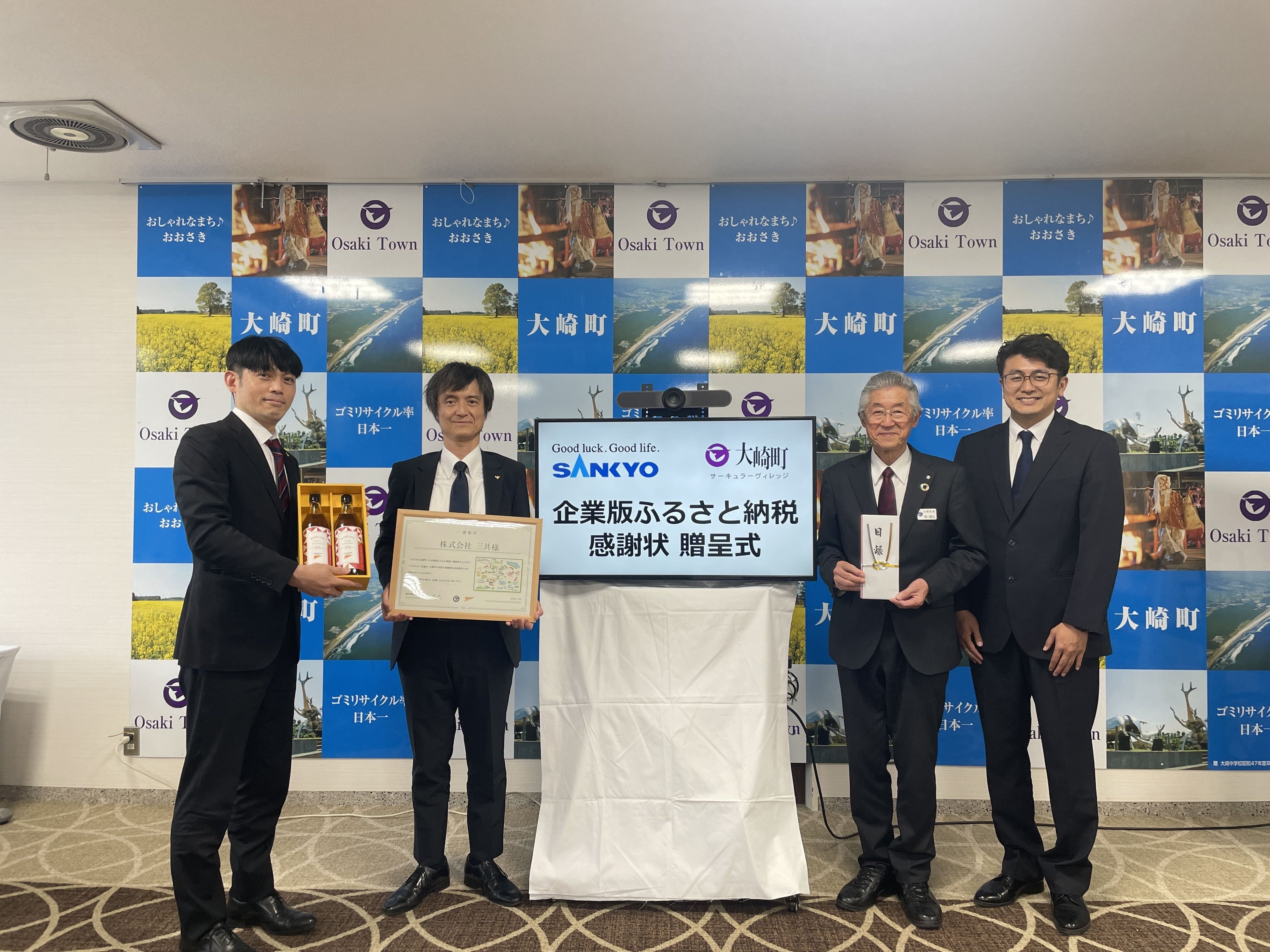 株式会社三共様、日本ゲームカード株式会社様には,昨年に引き続き企業版ふるさと納税の寄附先として大崎町を選定いただいたことに対しまして,心から感謝申し上げます。いただいた寄附金は本町が掲げる「リサイクルの町から世界の未来をつくる町へ」というビジョンの下,本町のSDGs推進事業に活用させていただきたいと存じます。すでにご承知のとおり、本町を取り巻く環境は,少子高齢化の進行による,人口減少社会の到来,長引く景気低迷,さらには新型コロナウィルス感染症の影響もあり、大変厳しいものとなっている中で,持続可能な地域づくりをどのように実践していくかということを、私たちは考えなければなりません。多様な地域課題に対して,これまでのような行政の取組だけでは対応しきれない部分があることも多くございます。このような状況の中で,県内5つの企業様とともに一般社団法人大崎町SDGs 推進協議会を運営し,持続可能な地域づくりに取り組んでいるところです。