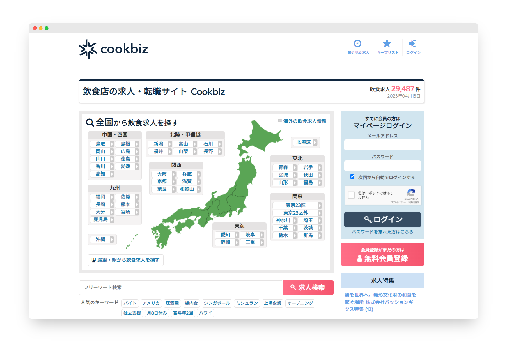 「クックビズ」は、正社員からアルバイト・パートまで約3万件の飲食業界の求人が掲載されており、年間150万人が利用する飲食業界最大級の人材サービスです。
