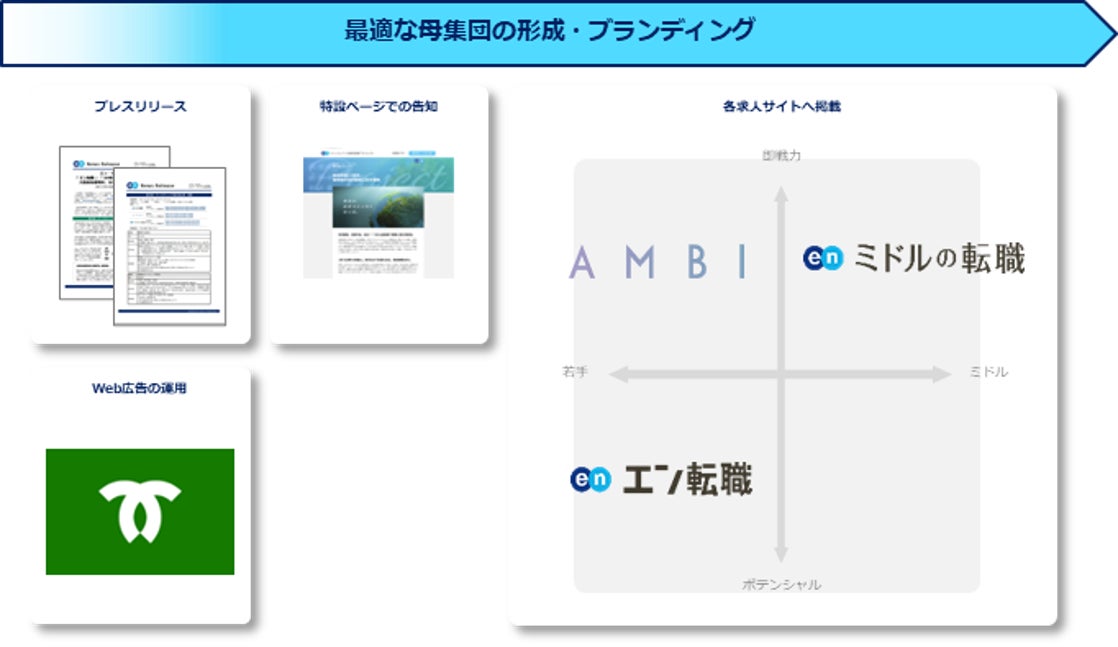 プレスリリースや特設ページ、Web広告での告知に加え、各求人サイトでの集客サポートを実施いたします。『エン転職』『AMBI』『ミドルの転職』とターゲットの異なる3つの求人サイトを活用することで、ターゲットへ網羅的に求人を届けます。