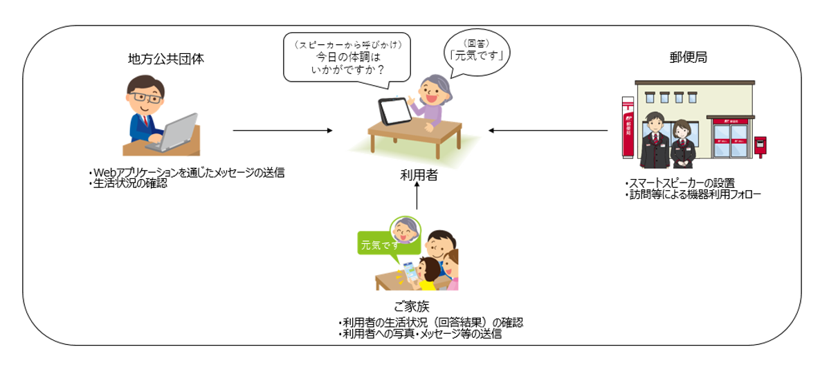 本実証は、日本郵便が提供するサービス「スマートスピーカーを活用した郵便局のみまもりサービス」を活用して実施するものです。