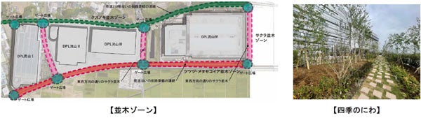 「DPL流山プロジェクト」は、植栽などで周辺環境に配慮した物流タウンです。4棟の物流施設の一体感が出るよう、接道部は大半を緑化するとともに、敷地内に「サクラ並木ゾーン」「クスノキ並木ゾーン」「ツツジ・メタセコイア並木ゾーン」を随所に配置し、植栽にもこだわりました。また、四季を通して花や草木をお楽しみいただけるよう、「DPL流山Ⅱ」には「四季のにわ」、「DPL流山Ⅳ」には「四季のひろば」を設けました。