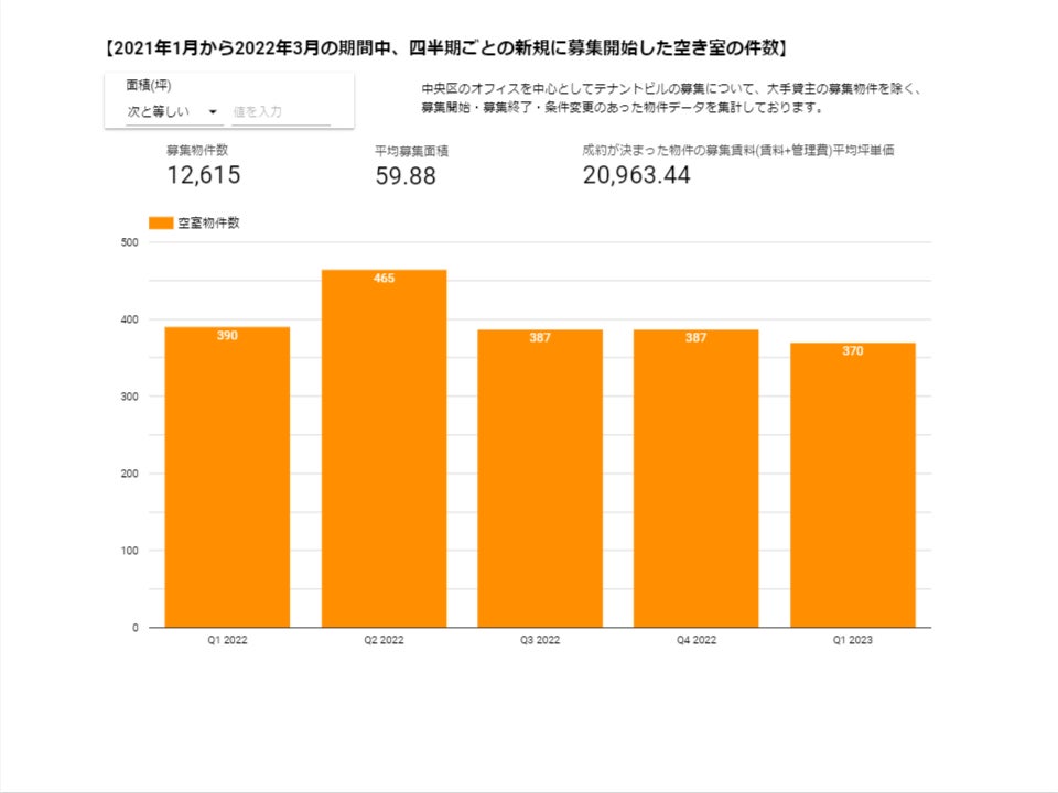最後のグラフは、賃貸条件の変更をした貸室件数の推移を表現しています。2022年第1四半期以降、条件変更件数が増えていましたが、2023年第1四半期に一度条件の変更が減少します。募集面積の大幅な減少・市況感を正しく判断した物件による賃料の引き上げといった条件の変更が相次いだ状況がうかがえます。