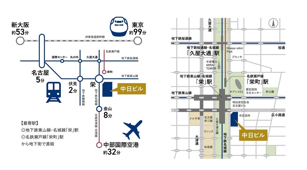 地下鉄東山線・名城線「栄」駅、名鉄瀬戸線「栄町」駅から地下街で直結