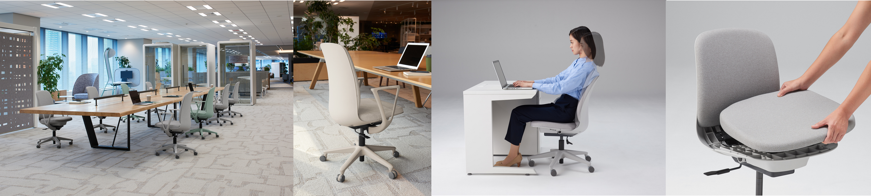 多様なインテリアデザインに柔軟に対応できるよう、豊富なCMFの選択肢とカラーバリエーションを揃えています。座り心地にもこだわり、座の芯材には独自のノウハウであるスリット入りのベンディングシートを採用し、やわらかな座り心地を実現、デザイン、機能性、価格のバランスを追及し、様々なシーンにマッチします。