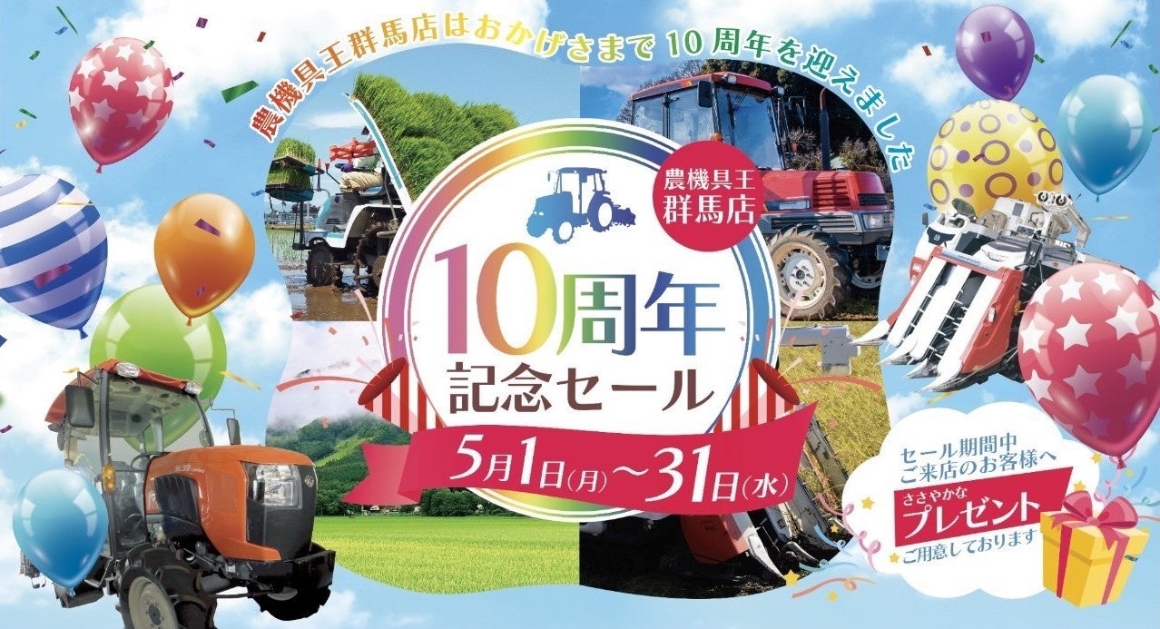 「農機具王 群馬店」は2023年5月1日で10周年を迎えます。それに伴い、2023年5月1日から5月31日まで、10周年記念セールを開催いたします。セール期間は、店舗スタッフ厳選の商品が、通常よりも“オトクな価格”でお買い求めいただけます。10年間変わらずご愛顧いただいたお客様への感謝を込めたセールとなっておりますので、スタッフが心を込めて準備いたしました。たくさんのお客様にご来店いただけることを願っております。※セールは店頭のみの開催となっております。