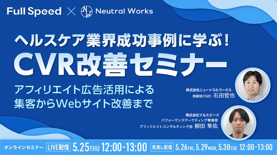 そこでこのたび、EC / D2Cビジネスをはじめ多くの企業様のアフィリエイト広告運用支援実績を持つ当社と、Webサイト改善により多くの企業様の獲得件数改善の実績を持つニュートラルワークス社の2社共催で「ヘルスケア業界 成功事例に学ぶ! CVR改善セミナー」と題したオンラインセミナーを開催します。