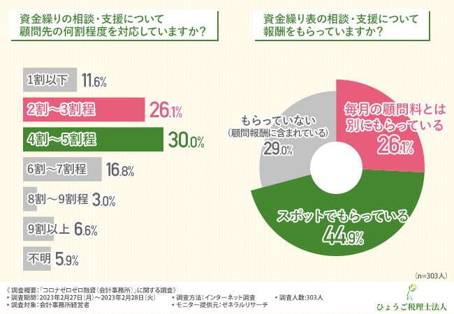 続いて、「資金繰り表の相談・支援について報酬をもらっていますか?」と質問したところ、『毎月の顧問料とは別にもらっている(26.1%)』『スポットでもらっている(44.9%)』『もらっていない(顧問報酬に含まれている)(29.0%)』という回答結果になりました。