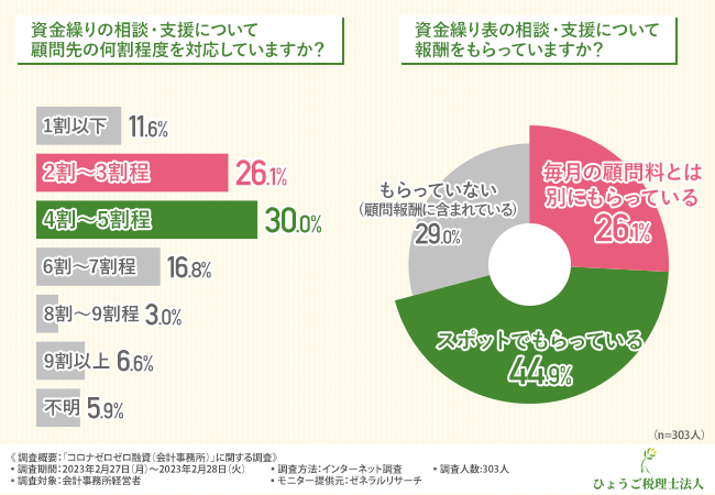続いて、「資金繰り表の相談・支援について報酬をもらっていますか?」と質問したところ、『毎月の顧問料とは別にもらっている(26.1%)』『スポットでもらっている(44.9%)』『もらっていない(顧問報酬に含まれている)(29.0%)』という回答結果になりました。