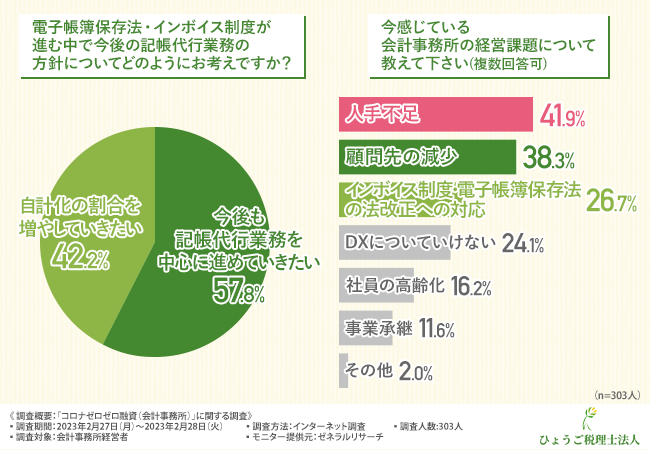 「人手不足」と回答した方が4割以上おり、また「顧問先の減少」「インボイス制度や電子帳簿保存法の対応」といった経営課題を感じているようです。