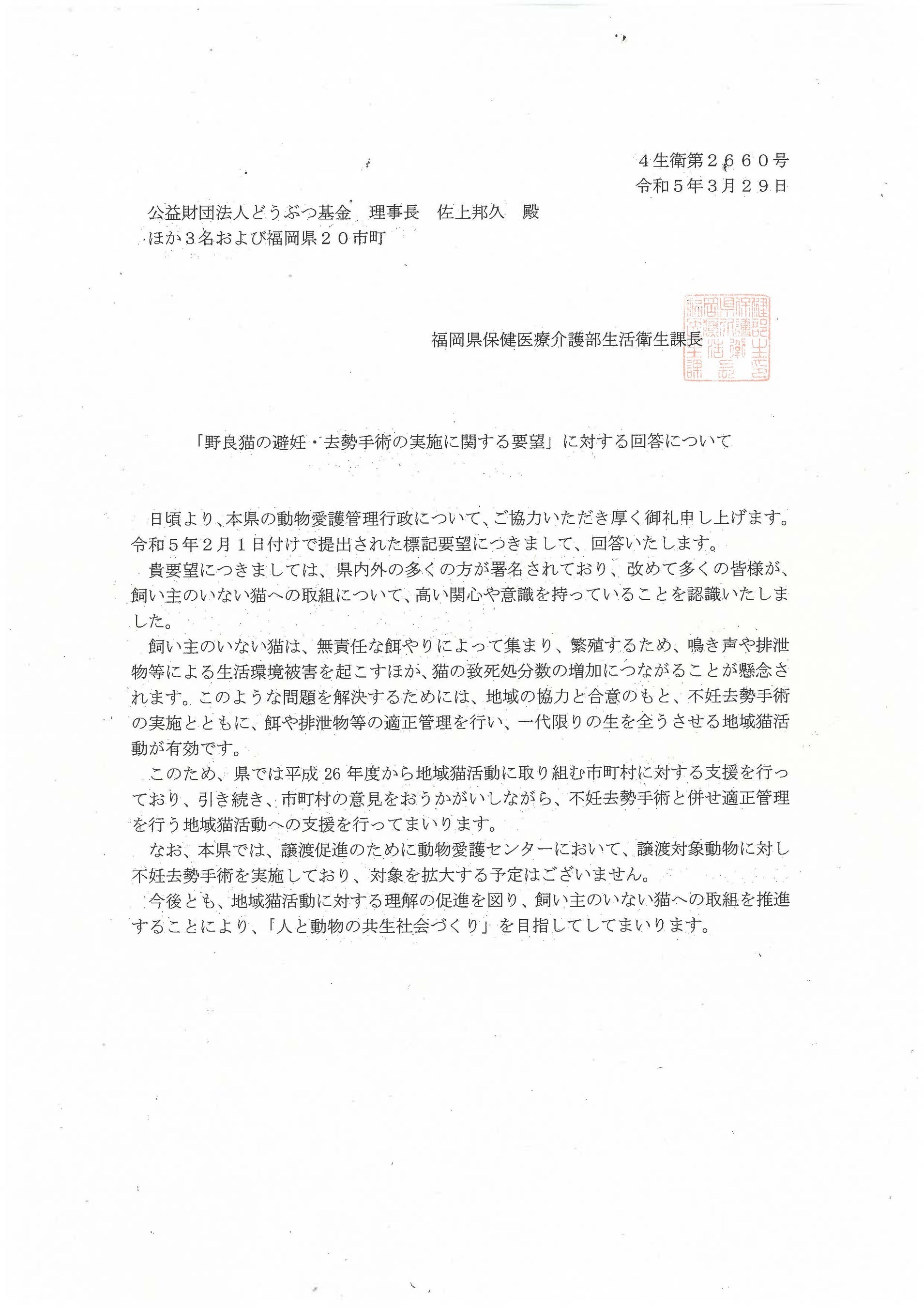 本年2月1日、公益財団法人どうぶつ基金(以下「どうぶつ基金」)は、前日本獣医師会会長の山根義久氏、福岡大学教授の山﨑好裕氏、弁護士の朝隈朱絵氏、福岡県内20市町と連名で「野良猫の避妊・去勢手術の実施に関する要望」を福岡県知事と福岡県議会に提出いたしました。しかしながら、同要望に対する福岡県からの回答は現状を正しく認識しておらず、連名した20市町ならびに1万筆を超える福岡県民の要望をまったく汲み取っていないゼロ回答であったことから、追加で集まったChange.org(オンライン署名)による4万筆の署名を添えて4月13日に要望書を再提出いたしました。