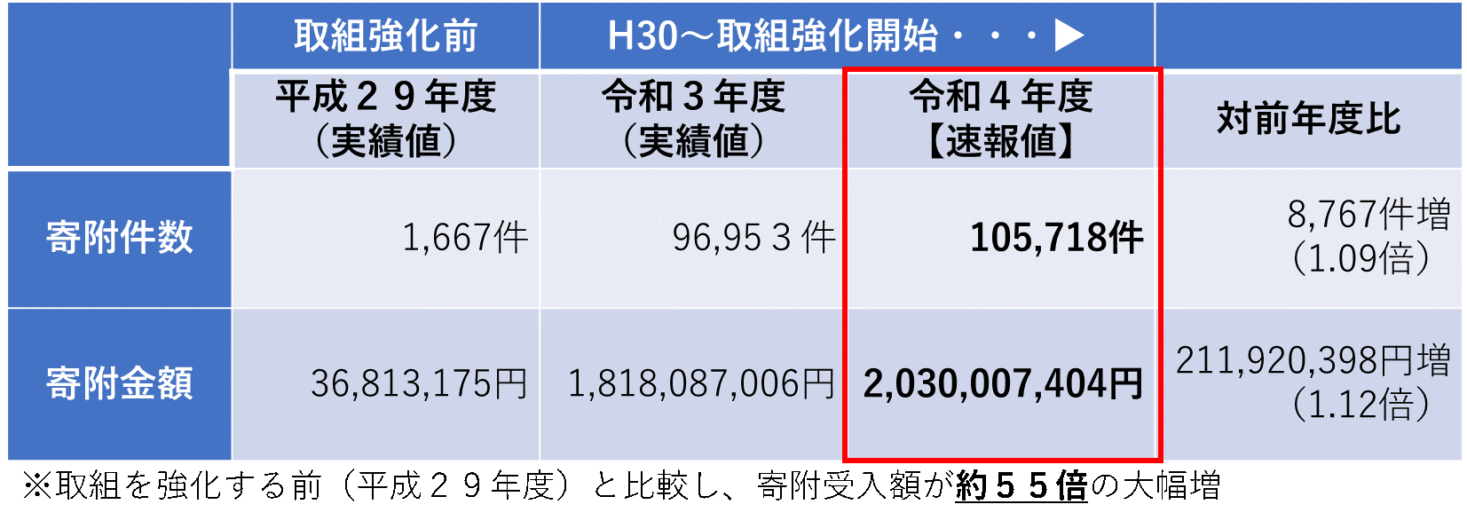 トレンドやニーズに応じた返礼品の開発及びPRや、返礼品提供事業者や寄附受付サイトの拡充を行ったことによる効果もあり、取組を強化した平成30年度からの5年間で、寄附受入額は約55倍と大幅増となっています。