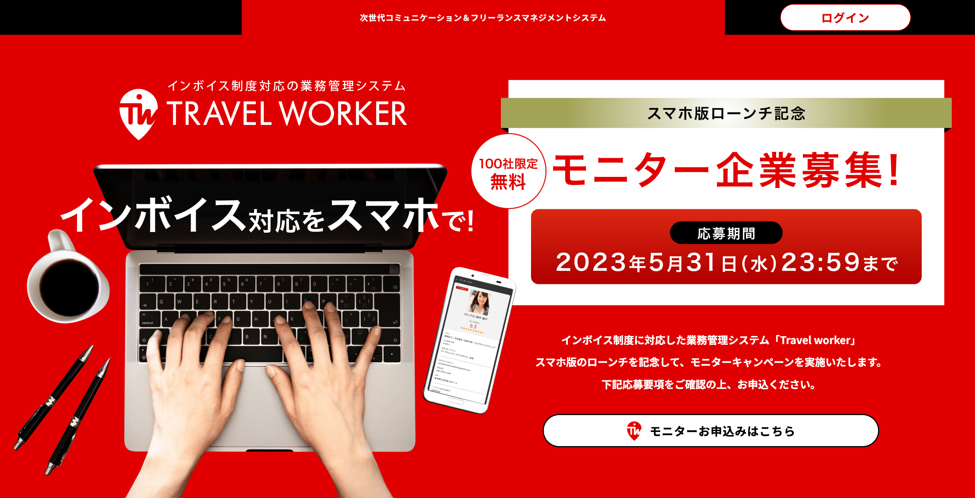 今回、スマホ版のローンチを記念して、2023年4月24日10:00より「モニターキャンペーン」を開催いたします。先着100社様限定で、1カ月間無料でご利用いただけるキャンペーンとなりますので、お気軽にお問合わせください。キャンペーンについて詳しくはこちら( https://travelworker.jp/monitorcampaign/ )
