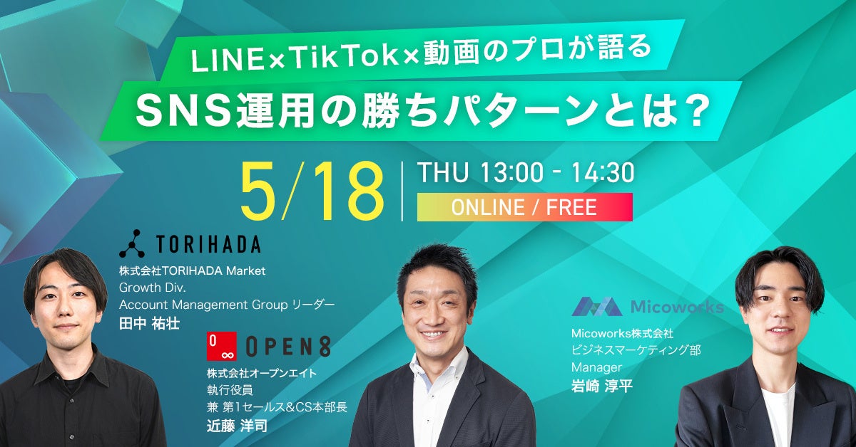 本ウェビナーでは、LINEを活用したコミュニケーションプラットフォーム「MicoCloud」を提供しているMicoworks株式会社・動画作成プラットフォーム「Video BRAIN」を提供する株式会社オープンエイト・ショートムービーマーケティングの株式会社TORIHADAが登壇します。LINEやTikTokのアカウント運用で成果を出すためのノウハウや動画制作の簡易化について解説します。