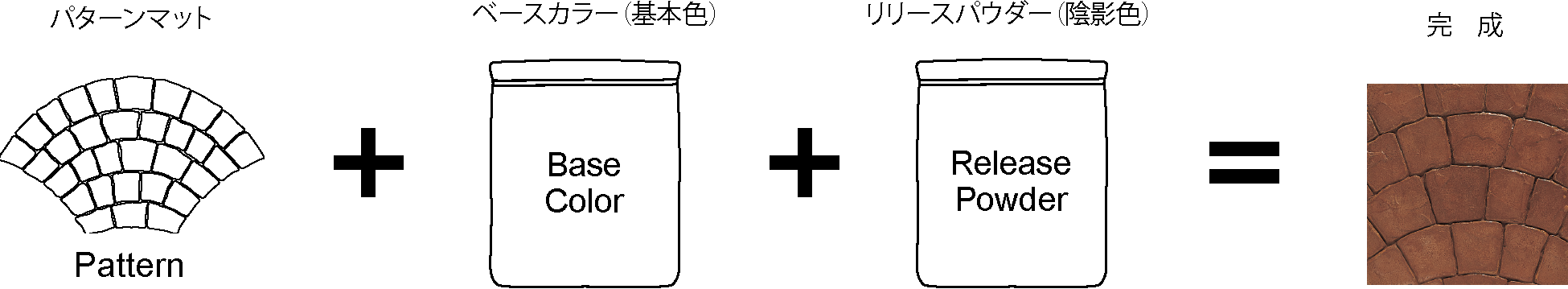 「デザインクリート」は硬化前の生コンクリートに2種類のカラー材を散布し、パターンマットと呼ばれる押し型で表面に立体感のある模様をつける床材です。パターン20種類、基本色18色、陰影色4色の合計1440通りの組み合わせから空間に適したデザインを選定することができます。