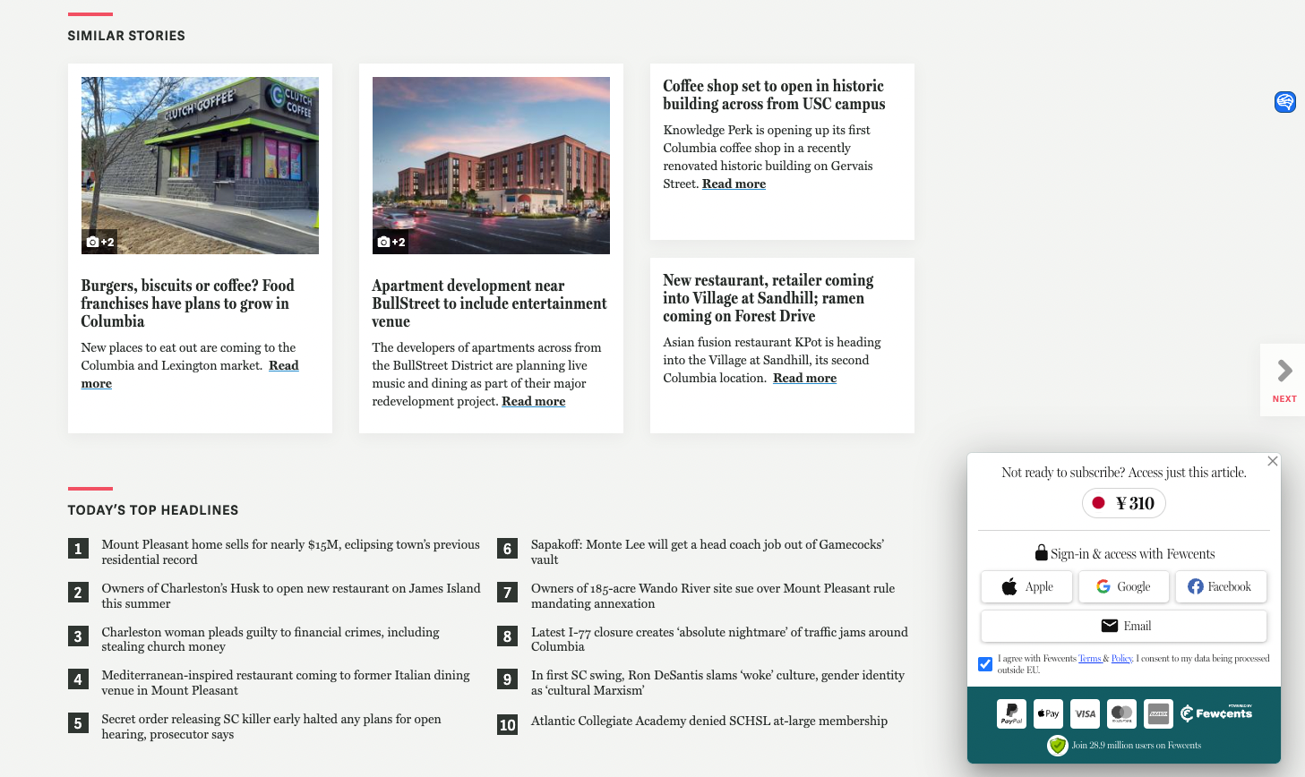 <Fewcentsのマイクロペイメントを実装した海外メディアのUIイメージ>