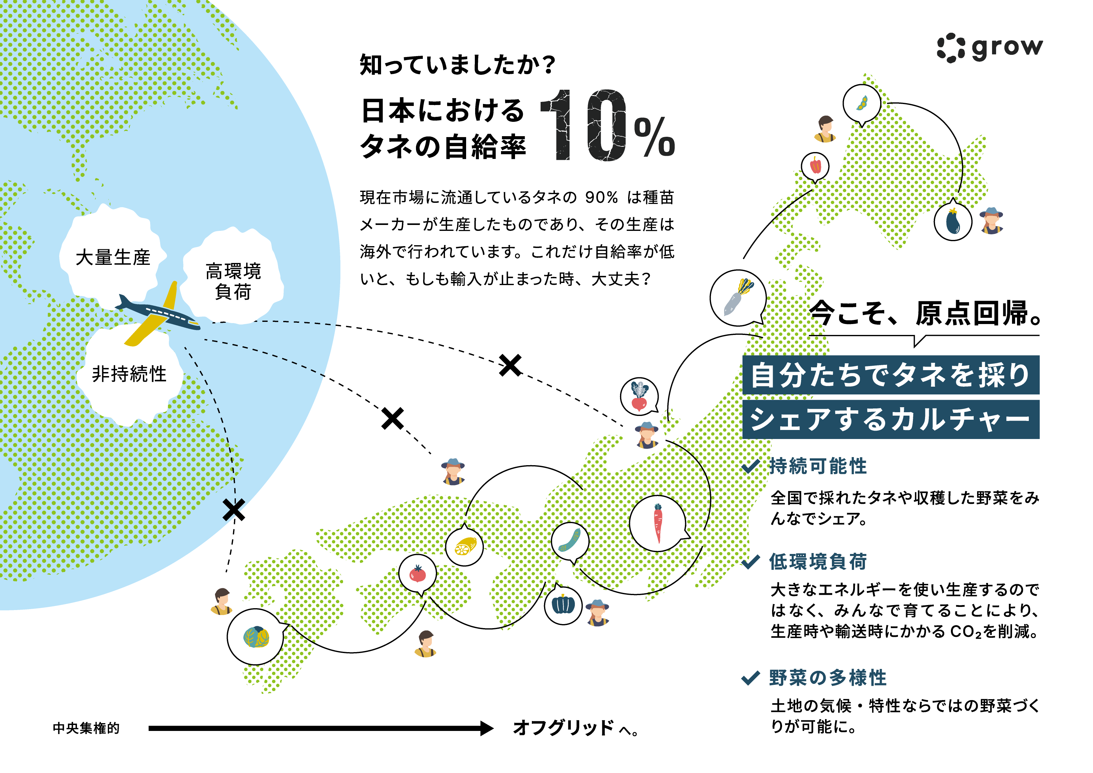 こういった世界的な背景を受けて、「種子から消費まで」の過程に農家、流通業者、市民が積極的に参加し、一体となった食の地域循環型システムを構築するべきである、という声も大きくなっています。