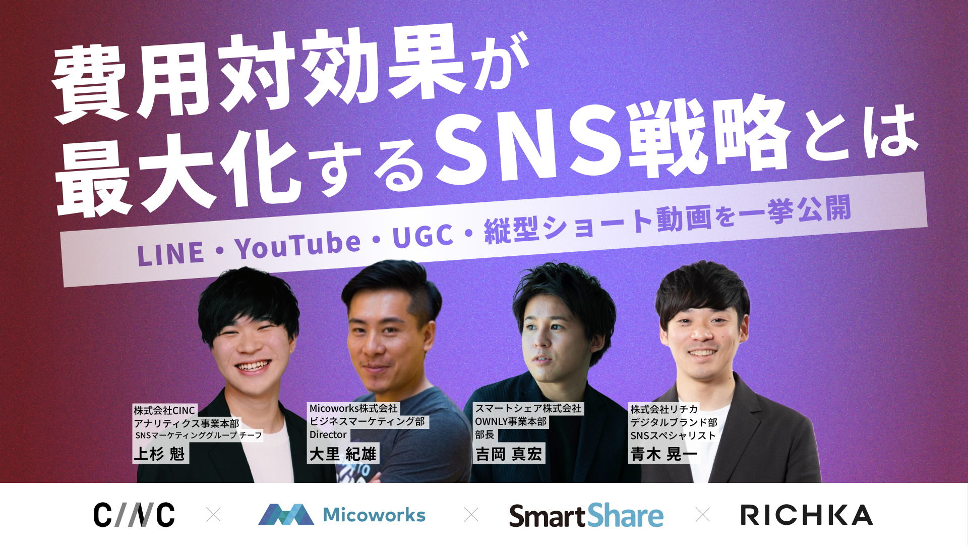 生活者の生活様式や価値基準が多様化しており、従来のマーケティング施策による新規顧客獲得が難しくなってきました。さらには、SNSの配信面が増えたことで、どの媒体でどのようなユーザーに企業の情報を届けるのかも複雑になっております。今回のセミナーでは、費用対効果が最大化するSNS戦略とはをテーマに、これからのSNS運用を効率化する方法をSNS支援のプロフェッショナルである4社が集まり、一挙公開いたします。
